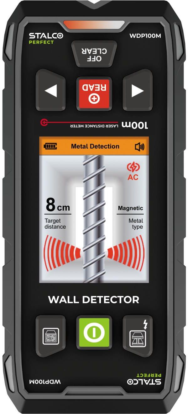 Wielofunkcyjny detektor ścienny STALCO PERFECT WDP100M to zaawansowane narzędzie, które łączy funkcje dalmierza laserowego z możliwością detekcji ukrytych elementów w ścianach, takich jak metale, przewody czy drewniane elementy. Wyposażony w czerwoną wiązkę laserową oraz kolorowy wyświetlacz, oferuje wyjątkową wszechstronność, będąc niezastąpionym podczas prac budowlanych i remontowych. Najważniejsze cechy Funkcja detekcji ściennej: WDP100M umożliwia precyzyjną detekcję metali żelaznych, metali nieżelaznych, przewodów miedzianych oraz drewnianych elementów do głębokości nawet 100 mm. Podczas wykrywania obiektów, kolorowy wyświetlacz z ikonami informuje użytkownika o wynikach w czasie rzeczywistym. Kolorowy wyświetlacz: Dzięki ekranowi o przekątnej 2,4 cala, WDP100M zapewnia doskonałą widoczność wyników zarówno przy pomiarach laserowych, jak i przy detekcji ścian. Wyraźne ikony poprawiają komfort pracy w różnych warunkach oświetleniowych. Precyzyjny pomiar laserowy: Urządzenie umożliwia pomiar odległości do 100 metrów, oferując dokładność ± (2 mm + d*1/10000) oraz możliwość zapisu do 30 pomiarów, co czyni je niezastąpionym w codziennej pracy. Wszechstronność zastosowań: WDP100M idealnie nadaje się do pomiarów laserowych w pomieszczeniach, a dzięki zaawansowanej funkcji detekcji można bezpiecznie uniknąć uszkodzenia ukrytych instalacji podczas prac montażowych. Akcesoria 1 x Pokrowiec 1 x Uchwyt na dłoń 1 x Przewód USB-C 1 x Płytka odblaskowa DANE TECHNICZNE Index: S058198001 Parametry pomiaru lasera: Zakres pomiarowy: 0,05 ~ 100 m*** Dokładność pomiaru odległości: ± (2 mm+d*1/10000) standardowa powierzchnia odbijająca w pomieszczeniach** Jednostka: 0,000 m; 0'00"1/32 Typ lasera: 630 ~ 670 nm, <1mW Automatyczne wyłączenie lasera: 20 s Przechowywanie danych: 30 grup Parametry ogólne: Automatyczne wyłączanie: około 5 minut Ekran wyświetlacza: kolorowy ekran 2,4 cala Akumulator: wbudowany akumulator litowo-jonowy 3,7 V 800 mAh, Czas pracy: 5000 pojedynczych pomiarów laserowych Rozmiar: 138,5*62*26,7mm Zakres wilgotności roboczej: w trybie metalowym; 0 ~ 85% RH w trybie obcego obiektu: 0~60%RH