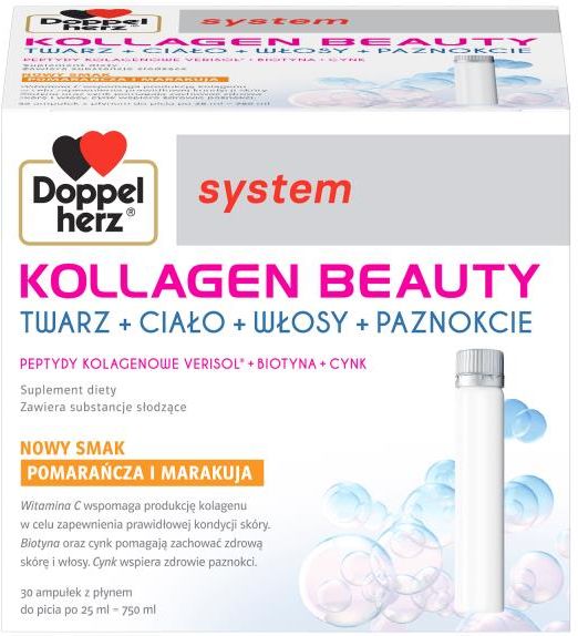 Doppelherz system KOLLAGEN BEAUTY smak POMARAŃCZA I MARAKUJA 30 ampułek po 25 ml 2,5 g bioaktywnych peptydów kolagenowych VERISOL® w jednej ampułce Działanie bioaktywnych peptydów kolagenowych VERISOL® potwierdzone badaniami naukowymi Witaminy i składniki mineralne, które pomagają zadbać o …