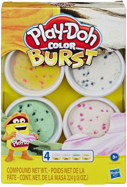 Hasbro Play-Doh - Ciastolina Wybuchowe kolory Lody E8061 Ciastolina Play-Doh król mas plastycznych! Play-Doh to ciastolina, czyli miękka masa plastyczna, dzięki której wszystkie dzieci mogą wyczarować, co tylko sobie wymarzą! Każdy znajdzie tu coś dla siebie: są samochody i domki, zwierzaki i figurki ludzie oraz wiele innych akcesoriów, które sprawią, że zabawa z Play-Doh nigdy się nie nudzi! Tyle pomysłów kryje się w małym tekturowym pudełeczku! Play-Doh to od ponad 40 lat zabawka kreatywna numer 1 na świecie. Rozwija dziecięcą wyobraźnię, kreatywność i sprawność manualną. Kolory, kolory, wszędzie kolory! Z zestawem Play-Doh Wybuchowe kolory (Color Burst) każdy dzień wypełniony będzie solidną dawką humoru. Uzupełnij swoją kolekcję ciastoliny Play-Doh z tym bogatym w kolory zestawem i stwórz zupełnie nowe zestawy z eksplozją kolorów! Rozwałkuj ciastolinę Play-Doh Color Burst, żeby stworzyć najciekawsze kształty i przemieniać ciastolinę w nowiutkie kolory! Pamiętaj, jedynym ograniczeniem jest twoja wyobraźnia! Czas rozpocząć kolorową zabawę!  Zawartość i cechy zestawu: 4 kolorowe tuby Play-Doh Color Burst 224g Wałek Parametry Przedział wiekowy Od 3 lat Wiek dziecka 3, 4, 5, 6, 7 Płeć Chłopiec, Dziewczynka Wymiary opakowania 22 x 14 x 4 cm Waga (kg) 0.4