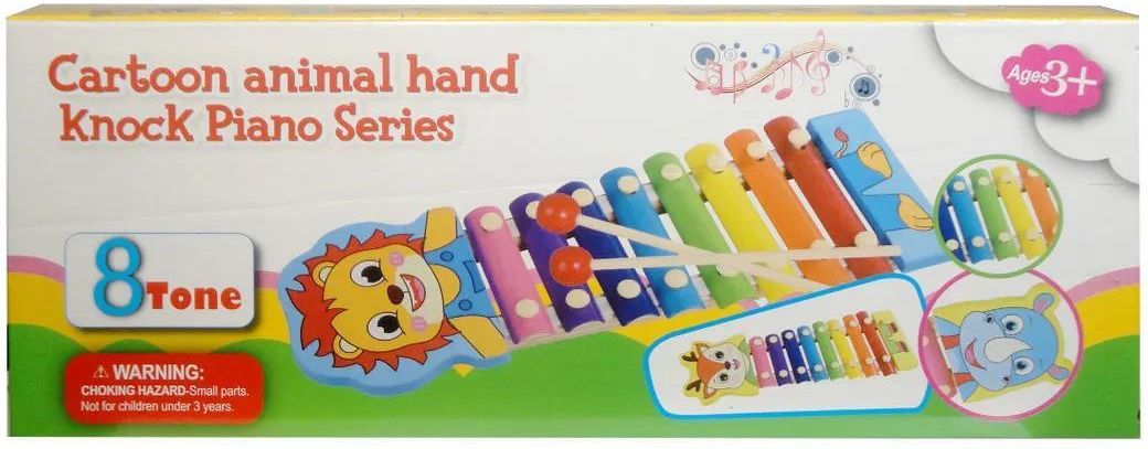 Cymbałki 8-tonowe z kolorowymi klawiszami i pałeczkami do grania. Produkt przeznaczony dla dzieci od lat 3. Produkt zapakowany w kartonowe pudełko. Podane wymiary są wymiarami opakowania.