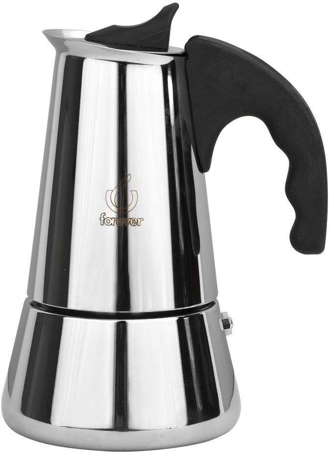 Smukła i elegancka kawiarka ze stali nierdzewnej, w kolorze srebrnym z czarnymi elementami.