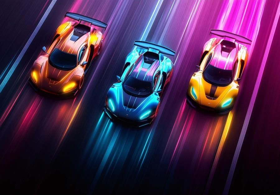 Fototapeta Sportowe Auta Neon – wyścigowe emocje na ścianie młodego fana motoryzacji Stwórz pełną energii przestrzeń dla młodego miłośnika szybkich samochodów dzięki fototapecie z motywem sportowych aut i neonowych efektów. Dynamiczna kompozycja przedstawiająca nowoczesne auta w ruchu, z efektownym …