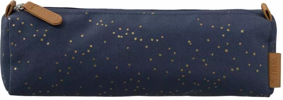 Fresk piórnik złote kropki indigo FB980-22 Uroczy piórnik Fresk pomieści wszystkie najpotrzebniejsze przybory małego ucznia.Piórnik zapinany jest na zamek błyskawiczny z wygodnym skórzanym uchwytem.Wykonany z przetworzonych butelek PET.Wymiary w przybliżeniu: 24 x 9 cm