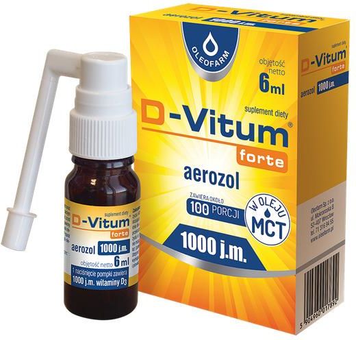 Nazwa produktu: D-Vitum Forte 1000 j.m. aerozol, 6 ml Rodzaj produktu: suplement diety Opis produktu: Witamina D bierze udział w wielu procesach zachodzących w organizmie. Pomaga w utrzymaniu zdrowych kości, zębów oraz prawidłowego poziomu wapnia we krwi. Wspomaga prawidłowe funkcjonowanie mięśni i układu odpornościowego. Wspiera prawidłowe wchłanianie i wykorzystywanie wapnia i fosforu, a także bierze udział w procesie podziału komórek.Organizm produkuje witaminę D na drodze syntezy skórnej pod wpływem promieniowania UV. Jednak stosowanie kremów z filtrami UV, bardzo mała ekspozycja na słońce oraz niska dostępność promieni słonecznych w naszej szerokości geograficznej w okresie od jesieni do wiosny ogranicza możliwość produkowania witaminy D w komórkach. Dlatego ważne jest dostarczanie odpowiednich jej ilości wraz z dietą.Zastosowanie: - preparat przeznaczony jest dla zdrowych osób dorosłych poniżej 75. roku życia w celu uzupełniania diety w witaminę D. Wykaz składników: Składniki: olej MCT (trójglicerydy o średniej długości łańcucha), cholekalcyferol (witamina D3), przeciwutleniacz: mieszanina tokoferoli. Ilości składników: Dzienna porcja (1 naciśnięcie pompki dozującej) zawiera:100 µg (4000 j.m., 2000% referencyjnej wartości spożycia) witaminy D3. Sugerowane dawkowanie: zdrowe osoby dorosłe poniżej 75. roku życia – 1 naciśnięcie pompki dozującej jeden raz dziennie Nie należy przekraczać zalecanej dawki produktu do spożycia w ciągu dnia. Instrukcja użycia: Bezpośrednio do ust lub do posiłku. Na buteleczkę z preparatem należy zamontować pompkę dozującą dołączoną do opakowania. Pompka pozwala na precyzyjne odmierzenie właściwej do spożycia porcji produktu. Przed pierwszym użyciem kilkakrotnie nacisnąć pompkę Przeciwwskazania: Nie stosować w przypadku nadwrażliwości na jakikolwiek składnik preparatu. Warunki przechowywania: Przechowywać w suchym miejscu w temperaturze poniżej 25 °C w sposób niedostępny dla małych dzieci. Chronić przed światłem. Dodatkowe informacje: Przed zastosowaniem wskazane jest wykonanie badania 25-(OH)D we krwi oraz konsultacja wyniku badania z lekarzem lub farmaceutą. Nazwa firmy produkującej środek/Adres podmiotu: Oleofarm Sp. z o.o.ul. Mokronoska 852-407 Wrocław Kraj lub miejsce pochodzenia: Wyprodukowano w Unii Europejskiej. Suplement diety (środek spożywczy) nie może być stosowany jako substytut zróżnicowanej diety. Celem suplementu diety jest uzupełnienie normalnej diety. Dodatkowe informacje o produkcie znajdują się w ulotce załączonej do produktu bądź na jego opakowaniu.