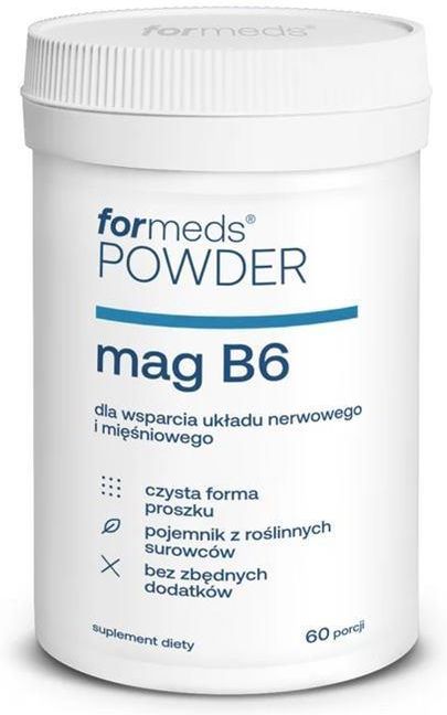 ForMeds POWDER MAG B6 60 porcji Cytrynian magnezu Witamina B6 POWDER MAG B6 - Cytrynian magnezu + Witamina B6 ForMeds Suplement diety 60 porcji - proszek Suplement diety F-MAG B6 zawiera magnez (cytrynian) oraz witaminę B6 w formie proszku. Cytrynian magnezu - Bardzo dobrze przyswajana forma magnezu, Witamina B6 - Wspomaga działanie magnezu, Innowacyjna forma proszku- Bez sztucznych wypełniaczy, barwników i konserwantów. Opis Magnez wspomaga działanie układu mięśniowego oraz nerwowego. Magnez i witamina B6 przyczyniają się do utrzymania prawidłowego metabolizmu energetycznego oraz do zmniejszenia uczucia zmęczenia i znużenia. Magnez zaliczany jest do makroelementów, czyli do składników, które stanowią nie mniej niż 0,01 proc. masy ciała. W organizmie pierwiastek ten spełnia szereg zadań. Najlepszą formą magnezu jeśli chodzi o suplementację jest cytrynian. Funkcje magnezu Jedną z właściwości magnezu w układzie szkieletowym jest fakt, że pomaga on regulować poziom wapnia w kościach i zębach. Może zwiększać aktywność witaminy D, która między innymi ułatwia wchłanianie wapnia. Magnez jest potrzebny do rozkurczania mięśni, natomiast wapń ułatwia skurcze. Magnez wpływa także na funkcjonowanie mięśni poprzez oddziaływanie na neuroprzekaźniki w układzie nerwowym. Pierwiastek ten jest szczególnie istotny w produkcji energii, a co za tym idzie jego niedobór często towarzyszy ogólnemu zmęczeniu i zaburzeniom związanym ze zmęczeniem. Odgrywa też ważną rolę w metabolizmie węglowodanów oraz jest potrzebny do syntezy i wydzielania hormonu insuliny, który ułatwia metabolizm komórkowy glukozy we krwi. Badania potwierdzają, że niedobór magnezu może poważnie zaburzyć równowagę hormonalną kobiet i niewątpliwie, w wielu przypadkach, wpływa na wystąpienie zespołu napięcia przedmiesiączkowego. W czasie ciąży i karmienia piersią zapotrzebowanie na ten pierwiastek wzrasta dwukrotnie. Wynika to z potrzeb rosnącego płodu, łożyska oraz ze wzrostu masy ciała kobiety ciężarnej. Poprzez rozkurczanie mięśni gładkich tętnic magnez ułatwia ich rozszerzanie, pozwalając zwiększyć przepływ krwi i zmniejszyć ciśnienie wywierane na ścianki tętnic. Magnez przyczynia się do zmniejszenia uczucia zmęczenia i znużenia, pomaga w utrzymaniu równowagi elektrolitowej, przyczynia się do utrzymania prawidłowego metabolizmu energetycznego, pomaga w prawidłowym funkcjonowaniu układu nerwowego, pomaga w prawidłowym funkcjonowaniu mięśni, pomaga w prawidłowej syntezie białka, pomaga w utrzymaniu prawidłowych funkcji psychologicznych, pomaga w utrzymaniu zdrowych kości, pomaga w utrzymaniu zdrowych zębów, odgrywa rolę w procesie podziału komórek. Witamina B6 jest niezbędnym koenzymem w wielu procesach organizmu, m.in. w metabolizmie aminokwasów, kwasów tłuszczowych, węglowodanów, hormonów i cholesterolu oraz syntezie neuroprzekaźników, hemoglobiny i kwasów tłuszczowych. Źródłem witaminy B6 są: ziemniaki, otręby pszenne, zarodki pszenne, mięso z piersi indyka, wątroba wieprzowa i wołowa, makrela, łososie, fasola biała, kasza gryczana, soja. Funkcje witaminy B6 Witamina B6, inaczej pirydoksyna, jest niezbędna dla prawidłowego funkcjonowania naszego organizmu. Po spożyciu jest wchłaniana z przewodu pokarmowego i magazynowana głównie w mięśniach i wątrobie. Jest ona bardzo ważnym koenzymem w wielu procesach, m.in. w metabolizmie aminokwasów, kwasów tłuszczowych, węglowodanów, hormonów i cholesterolu. Witamina B6 jest potrzebna do utrzymania prawidłowej równowagi hormonalnej. Stwierdzono, że witamina B6 obniża poziom estrogenu we krwi. Na tej postawie można wnioskować, że jest to ważna cecha w leczeniu zespołu napięcia przedmiesiączkowego, zwłaszcza stanów rozdrażnienia, depresji, wzdęcia, obrzmienia piersi i trądziku. Pirydoksyna jest potrzebna dla prawidłowego funkcjonowania układu nerwowego, bierze udział w produkcji neuroprzekaźników takich jak serotonina, dopamina i noradrenalina. Ma również wpływ na ciśnienie krwi, skurcze mięśni i pracę serca, podnosi nawet odporność organizmu, gdyż uczestniczy w tworzeniu przeciwciał. Niedobór witaminy B6 powoduje wzrost homocysteiny we krwi, która przyczynia się do uszkodzeń ścianek naczyń krwionośnych przez wolne rodniki. Podwyższony poziom tego aminokwasu jest również jednym z głównych czynników ryzyka chorób serca. Niedobór witaminy B6 doprowadza także do zmian zapalnych skóry i błony śluzowej jamy ustnej. Konsekwencją jej niskiego poziomu w organizmie mogą być zmiany w układzie nerwowym objawiające się depresją, obniżeniem nastoju, bezsennością itp., zwiększona podatność na infekcje, niedokrwistość makrocytarna (niedobarwliwa) i kamica nerkowa. Witamina B6 pomaga w prawidłowej syntezie cysteiny, przyczynia się do utrzymania prawidłowego metabolizmu energetycznego, pomaga w prawidłowym funkcjonowaniu układu nerwowego, pomaga w utrzymaniu prawidłowego metabolizmu homocysteiny, przyczynia się do utrzymania prawidłowego metabolizmu białka i glikogenu, pomaga w utrzymaniu prawidłowych funkcji psychologicznych, pomaga w prawidłowej produkcji czerwonych krwinek, pomaga w prawidłowym funkcjonowaniu układu odpornościowego, przyczynia się zmniejszenia uczucia zmęczenia i znużenia, przyczynia się do regulacji aktywności hormonalne. _____________________________________________________________________________ Porcja dzienna 0,93 g zawiera (referencyjna wartość spożycia %): Cytrynian magnezu 930 mg, w tym: magnez 140 mg (36 %), Witamina B6 0,7 mg (50 %). _____________________________________________________________________________ Informacje ogólne Składniki: Magnez (cytrynian magnezu), witamina B6 (P-5-P 5'-fosforan pirydoksalu). Ilość porcji w opakowaniu: 60 Sposób użycia: Wsypać 1 porcję (1 płaska miarka) do suchego naczynia. Dodać 200 ml wody lub in