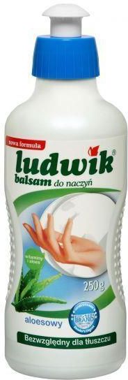 Płyn do mycia naczyń LUDWIK BALSAM Aloes 250g Ludwik balsam aloesowy jest bezwzględny dla tłuszczu i łagodny dla dłoni. Częsty kontakt skóry dłoni z detergentami to zmora tych, którzy często zmywają, szczególnie ludzi związanych zawodowo z gastronomią oraz osób szczególnie wrażliwych na odtłuszczające właściwości płynów. Ludwik balsam aloesowy to odpowiedź na ich potrzeby; ma pH neutralne dla skóry a wyciąg z aloesu chroni ręce przed szkodliwym działaniem środków chemicznych. Nowa receptura została również wzbogacona kompleksem witamin A,E,F,H, mającym działanie ochronne i odżywcze dla skóry rąk. Dzięki nowemu Ludwikowi naczynia pozostają krystalicznie czyste i lśniące. Balsam ulega biodegradacji, jest przyjazny dla środowiska. Jego gęsta konsystencja zapewnia wyjątkową wydajność. Delikatny zapach i właściwości myjące sprawiają, że zmywanie staje się przyjemne i ekonomiczne. Posiada Świadectwo Jakości Zdrowotnej Państwowego Zakładu Higieny. Przebadany dermatologicznie.