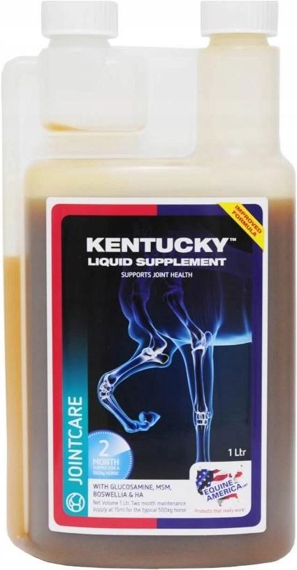Kentucky Liquid Supplement 1 l - nowy skład (wzmocniony o kadzidłowca (Boswellia) Preparat ulega naturalnej krystalizacji. Mogą występować kryształki. Skuteczny i niedrogi preparat wspomagający stawy konia. Zawiera w swoim składzie glukozaminę, MSM, kwas hialuronowy, kolagen, ekstrakt kadzidłowca …