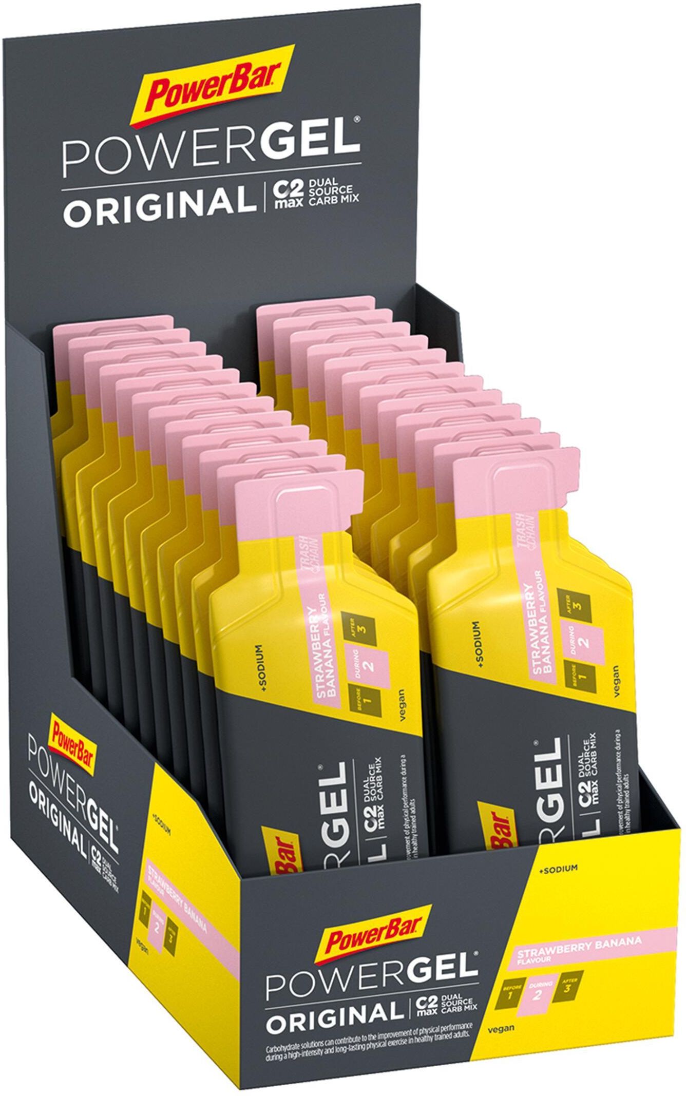 PowerBar | Power Gel 24x41ml Paczka | Żel Energetyczny Żel energetyczny PowerGel Original + Sód Producent: PowerBar Zastosowanie: Przed, podczas i po treningu Forma: Żel Gramatura: 24szt x41 ml 1 żel zawiera 26g szybko-przyswajalnych węglowodanów Zapewnia szybką dostawę węglowodanów dwufazową formułą C2MAX Bez popijania wodą Lekkostrawny natychmiastowo uzupełnia glikogen mięśniowy zapewnia 20-30 minut dodatkowej energii Stosowany przez elitarne teamy kolarzy, biegaczy i drużyny piłkarskie Smaki Green Apple (Zielone Jabłko), Black Currant (Czarna porzeczka), Espresso - zawierają kofeinę. Szczegółowe informacje w składzie. PowerGel to zaawansowany żel energetyczny, któremu na całym świecie zaufało tysiące profesjonalnych sportowców z różnych dyscyplin. Żele te gwarantują natychmiastową dawkę solidnej energii podczas długotrwałego wysiłku. Dzięki zaawansowanej dwufazowej kompozycji zawarte w PowerGel składniki łatwo i szybko wchłaniane przez organizm, nie obciążając układu trawiennego. Są szybko przyswajalne i szybko wchłanialne.. PowerBar żel energetyczny ma za zadanie uzupełnić niedobór energetyczny w trakcie długiego wysiłku, kiedy organizm spala skumulowaną energię, a najlepiej przyswajalną formą jest właśnie skoncentrowany żel. Szybko przyswajalne żele energetyczne PowerGel PowerBar PowerGel to pierwsze żele energetyczne z unikalną dwufazową formułą C2MAX, która łączy dwie wzajemnie się uzupełniające formy szybko-wchłanialnych węglowodanów: fruktozę i glukozę. Żele z kofeiną Część żeli PowerGel Original w składzie zawiera dodatek kofeiny nawet do 100 mg dzięki czemu można wydłużyć czas trwania treningu oraz opóźnić uczucie zmęczenia i znużenia. PowerBar PowerGel nie zawieraa takich substancji jak gluten czy tych pochodzenia zwierzęcego, dlatego może być stosowany przez osoby chore na celiakię oraz wegan i wegetarian. Jak deklaruje producent żele energetyczne PowerGel znajdują się na tzw. Liście Kolońskiej®, na której znajdują się jedynie wyselekcjonowane suplementy ze „zminimalizowanym ryzykiem dopingu”, gwarantujące brak wszelkich substancji dopingujących. Skład Wartość odżywczaw 100 g w saszetce (41 g) Wartość energetyczna kJ (kcal) 1066 (251) 437 (103) Tłuszcz 0 g 0 g - w tym kwasy tłuszczowe 0 g 0 g Węglowodany 63 g 26 g - w tym cukry 29 g 12 g Białko 0 g 0 g Sól 1,3 g 0,52 g Sód 503 mg 206 mg