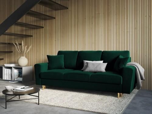 Rozkładana 3-osobowa sofa MOGHAN butelkowa zieleńZielona sofa do salonu dla trzech osób, która po rozłożeniu zamienia się w wygodne łóżko o wymiarze 190x140 cm.Dodatkowym atutem są dołączone w zestawie dwie dekoracyjne i zarazem praktyczne poduszki (45x45 cm każda).Funkcjonalną ozdobą sofy są także jej złote, metalowe nóżki o okrągłym, zwężanym do dołu przekroju.Wypełnienie siedziska stanowi pianka poliuretanowa o wysokiej sprężystości 30 kg/m³ oraz watolina 300 g/m², natomiast oparcia - silikon.Sofa tapicerowana jest luksusową, aksamitną tkaniną obiciową z delikatnym połyskiem. Materiał posiada bardzo dobrą odporność na ścieranie, co znacznie zmniejsza ryzyko jego uszkodzenia. Niezwykle miękki, jedwabisty w dotyku. Tkanina przeszła test papierosowy, co oznacza, że system tapicerski jest odporny na tlenie i zapalanie płomieni oraz spełnia normę PN-EN 1021-1: 2014-12.Komponenty: rama z litego drewna sosnowego, płyty wiórowe, płyty pilśniowe, sklejka, sprężyny, złote metalowe nogi.Pielęgnacja: Mebel czyść miękką szczotką, unikaj silnego tarcia, nie używaj odkurzacza. Części metalowe i drewniane nie powinny być narażone na długotrwały kontakt z wodą - w razie potrzeby przetrzyj wilgotną szmatką, używaj neutralnych detergentów, myj kolistymi, delikatnymi ruchami. Tapicerka sofy, szczególnie w jasnych kolorach, jest narażona na barwienie innymi tkaninami, głównie odzieżą, np. dżinsami. Nie jest to wada tapicerki, ale wada tkaniny odzieżowej.WYMIARYSzerokość: 235 cmSzerokość siedziska: 195 cmGłębokość: 100 cmGłębokość siedziska: 60/80 cmWysokość: 88 cmWysokość siedziska: 45 cmWysokość oparcia: 45 cmWysokość nóżek: 12 cmWysokość podłokietników: 62 cmSzerokość podłokietnika: 23 cmMax. obciążenie: 350 kgŁóżko: 190x140 cmPojemnik na pościel: 170x55x16 cmMATERIAŁTkanina: aksamit Riviera 38Nóżki: metalWypełnienie: pianka poliuretanowa, watolina, silikonKOLORTapicerka: butelkowa zieleńNóżki: złoty