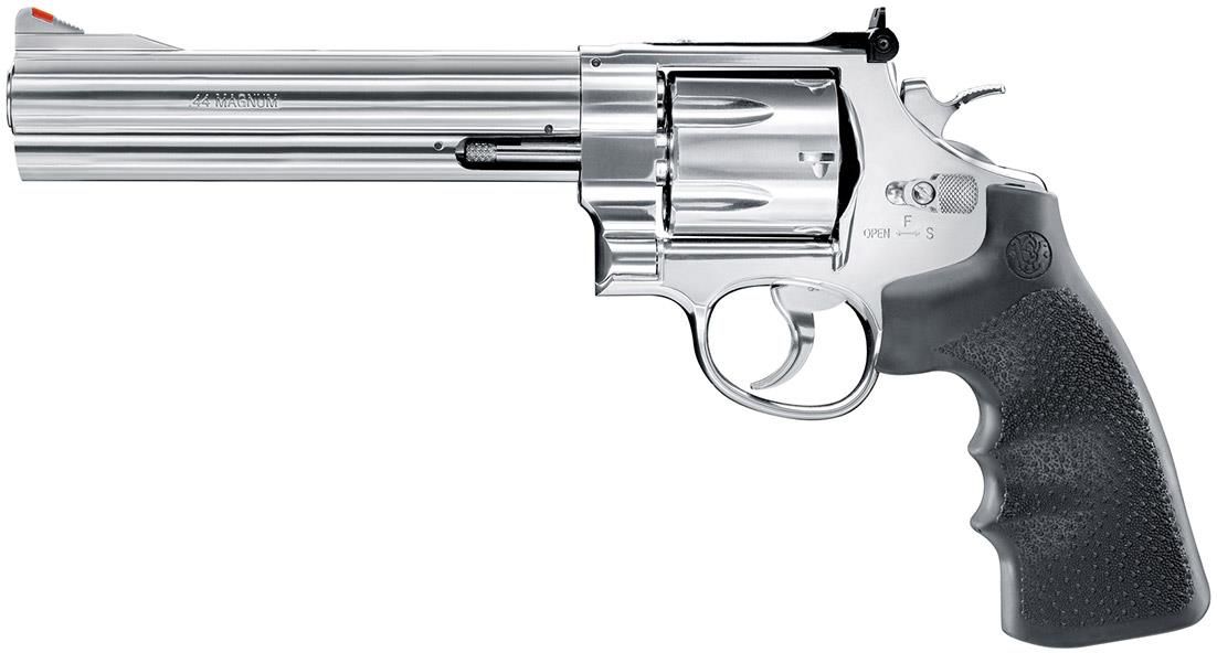 Wiatrówka - rewolwer będąca wierną repliką kultowego rewolweru Smith & Wesson 629, określanego potocznie także jako 44 Magnum od rodzaju użytkowanej amunicji. 629 zyskał szeroką popularność, dzięki serii filmów o Brudnym Harrym , gdzie był użytkowany przez tytułowego bohatera, sportretowanego przez Clinta Eastwooda. Rewolwer wykonano niemal w całości z metalu . Ten materiał zastosowano do wytworzenia szkieletu, lufy, bębna, kabłąka i spustu. Jedynie okładziny chwytu wyprodukowano z gumowanego tworzywa z antypoślizgową fakturą. Licencjonowana replika rewolweru powstała we współpracy z producentem palnego pierwowzoru. Dzięki temu na wiatrówce znalazły się oryginalne oznaczenia Smith & Wesson . Wiatrówka zasilana jest 12 g nabojem CO2 , który nadaje wystrzelonemu śrutowi typu diabolo 4,5 mm prędkość początkową na poziomie 103 m/s . Gniazdo na kapsułę CO2 znajduje wewnątrz chwytu, pod okładzinami. Pojedyncza kapsuła wystarcza na nawet 160 strzałów o zbliżonej prędkości wylotowej. Wiatrówka wyposażona została w mechaniczne przyrządy celownicze, muszkę z kontrastową wkładką oraz regulowaną w obu płaszczyznach szczerbinkę . Rolę magazynka pełni obrotowy bębenek, mieszczący 6 atrap nabojów. W każdej z łusek umieszcza się po 1 śrucinie. W zestawie znajduje się: - wiatrówka, - komplet łusek. Dane techniczne Kaliber: 4,5 mm (.177) Typ śrutu: diabolo Napęd: 12 g nabój CO2 Materiał: metal i tworzywo sztuczne Długość lufy: 165 mm Długość całkowita: 308 mm Pojemność magazynka: 6 szt. Prędkość początkowa kulki: 103 m/s Waga: 1325 g Kolor: srebrny i czarny Producent: Umarex, Niemcy & Smith&Wesson, USA