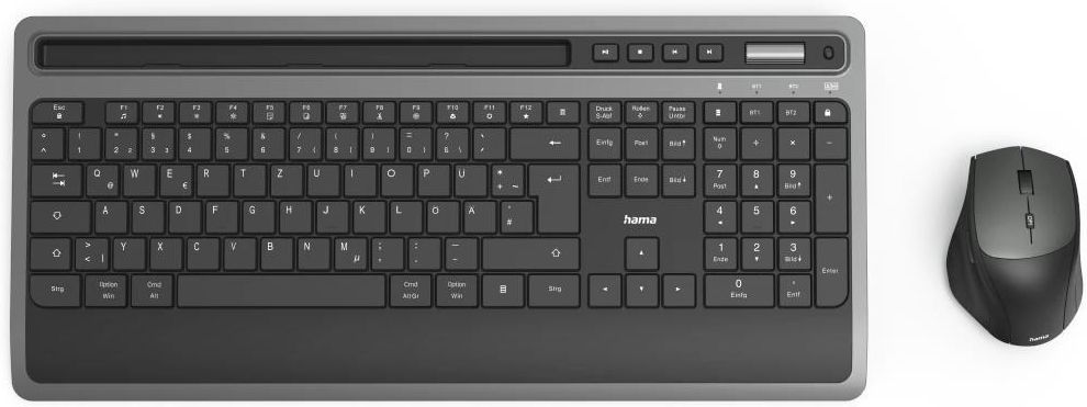 Hama Zestaw MKB KMW-600 Plus czarny-antracyt U8182686   Klawiatura: Typ klawiatury: membranowa Rodzaj: bluetooth Typ podłączenia: bluetooth Podświetlenie klawiatury: nie Wbudowany HUB USB: nie Klawiatura numeryczna: tak Klawisze multimedialne: tak Klawisze internetowe: tak Kolor: czarno-szary   Mysz: Sensor: optyczny Rodzaj: bezprzewodowa Czułość: 2400dpi Typ podłączenia: bezprzewodowy i radiowy Liczba rolek: 1 Podświetlane elementy: nie Kolor: czarno-szary Zasilanie: 1 bateria AA (LR6)