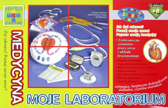Moje laboratorium MEDYCYNA zawiera opis i niezbędny sprzęt do wykonania bardzo ciekawych i całkowicie bezpiecznych doświadczeń. Zestaw przeznaczony jest dla dzieci i młodzieży ciekawych świata, których fascynuje eksperymentowanie i samodzielne odkrywanie. Dzięki zestawowi poznasz lepiej własne ciało, dowiesz się jak pracuje serce, jak wpływają ćwiczenia na nasz puls, jak utrzymać dobrą formę fizyczną oraz czuć się zdrowo i komfortowo. Jest to wspaniała nauka przez zabawę. Każde doświadczenie zawiera w instrukcji prosty i czytelny opis i jest bogato ilustrowane. Odpowiednie dla dzieci powyżej 8-go roku życia. Większość doświadczeń należy przeprowadzać po nadzorem osób dorosłych.Producent: Dromader