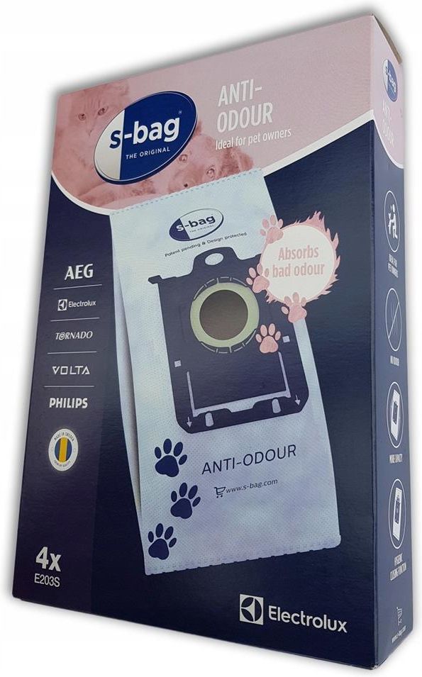 WOREK DO ODKURZACZA E203S Antyzapachowe worki S-bag® W odróżnieniu od zwykłych worków papierowych, które chłoną wilgoć, worki s-bag®  Anti-Odour  są wykonane z wytrzymałego syntetycznego materiału pokrytego woskową substancją pochłaniającą zapachy, aby nie wydobywały się one z odkurzacza. Tę unikalną cechę z pewnością docenią właściciele zwierząt.