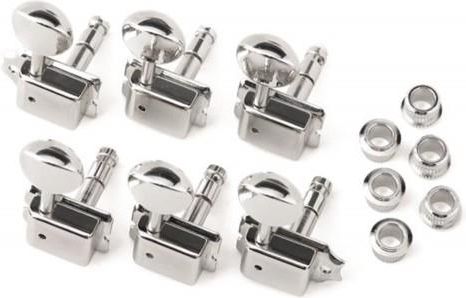 Fender /Gotoh vintage locking tuners for electric guitars Zestaw 6 kolorów: nikiel Konstrukcja blokująca do szybkiej zmiany strun i zwiększonej stabilności tuningu 6-in-line (prawo-ręczna) Kompatybilny z: większość serii Vintage USA/Mexican-made ratio: 1:15 15/16 cali (23,8 mm) śruba montażowa z odległością: 6 x tuleja, 7 x śruba