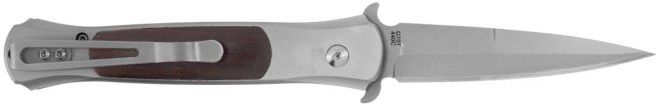 Nóż składany automatyczny Ganzo G707 Nóż składany automatyczny Ganzo G707 to nowość która wyróżnia się od innych noży edc tej firmy automatycznym otwarciem ostrza. G707 to niezwykle elegancki i precyzyjnie wykonany nóż składny z możliwością szybkiego otwarcia. Ganzo G707 to średnich rozmiarów folder typu EDC. Precyzyjne ostrze z charakterystycznym szlifem sztyletowym podkreśla agresywny klimat noża. Ostrze wykonane jest ze stali 440C i posiada blokadę typu "button lock", która pewnie zabezpiecza je przed złożeniem. Ergonomiczna rękojeść wykonana z aluminium posiada wstawki z precyzyjnie wykończonego drewna. Antypoślizgowa faktura rękojeści zapewnia bezpieczny chwyt w każdych warunkach. Umieszczony na rekojeści klips pozwala na pewne i dyskretne przenoszenie noża. Do noża dołączone jest eleganckie opakowanie. Blokada to sprawdzony system o nazwie "button lock", który powoduje że operowanie nożem jest bezpieczne. System blokujący jest także łatwy i intuicyjny w obsłudze. Dane techniczne: model: G707 stal: 440C blokada: button lock rękojeść: Aluminium/Drewno długość ostrza: 8,5 cm długość całkowita: 20,5 cm grubość ostrza: 3 mm Gwarancja 12 miesięcy.