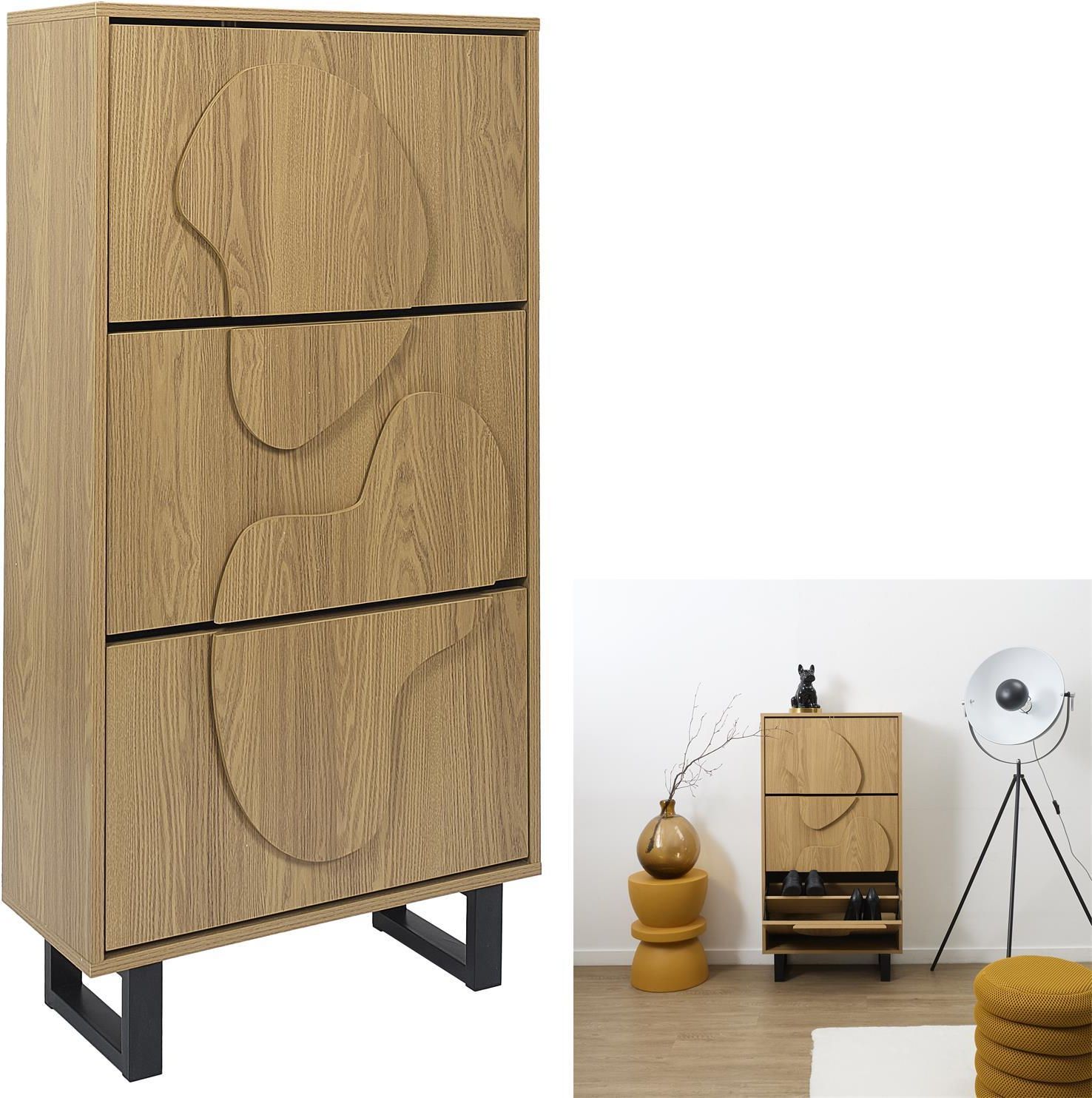 Szafka na buty Calypso dąb/czarna - styl i funkcjonalność Calypso to szafka na buty, która łączy w sobie elegancję i praktyczność. Wykonana z płyty MDF o wyglądzie dębu, prezentuje się niezwykle stylowo i naturalnie. Fronty szafki są uchylne, co umożliwia łatwe wkładanie i wyjmowanie butów. Szafka …