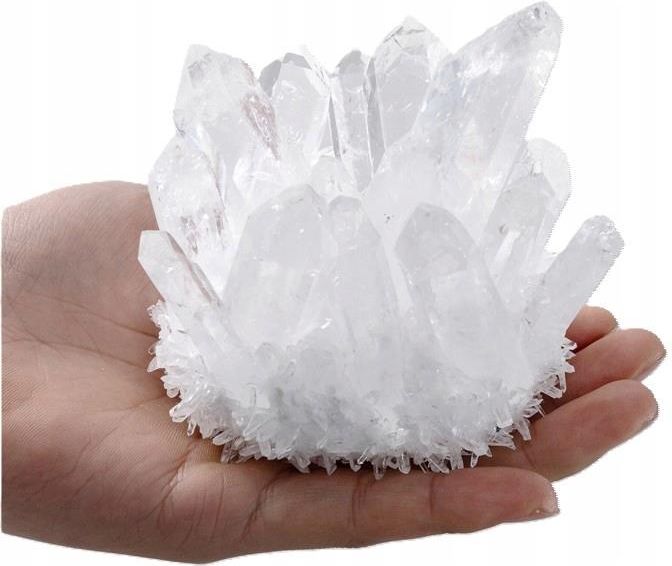 Kryształ dekoracyjny biały Oszałamiający okaz dla miłośników wyjątkowych dekoracji! Jest niezwykle dekoracyjny. ❇️ Z pewnością przykuje wzrok, a przede wszystkim wzbogaci przestrzeń swoim kolorem i kształtem. Formacja to zwarte skupisko kryształów kwarcu. Uroku dodaje drobna mgiełka iskrzących igiełek kwarcu wzdłuż trzonu każdego pojedynczego kryształu oraz wokół podstawy. Informacje Wymiary: około 60 x 90 x 70 mm Waga: około 400-500 g Cena dotyczy 1 sztuki Kamień: kwarc laboratoryjny Forma: szczotka Kolor: przezroczysty, biały Spód szczotki jest jest klejony Uwaga dotycząca bezpieczeństwa: drobne igiełki mogą łatwo wbić się w palce, dlatego należy obchodzić się z nimi ostrożnie. Najlepiej chwytać kryształ poprzez materiał ochronny lub za gładkie miejsca, w których nie ma igiełek. Okaz do wysyłki wybieramy intuicyjnie. Każdy jest unikatowy, dlatego Twój na pewno będzie jedyny w swoim rodzaju. Zdjęcia przedstawiają przykładowe kryształy. Pakujemy bezpiecznie, żeby minerały dotarły do właściciela w dobrym stanie. Mogą zdarzyć się obłamania drobnych igiełek, ponieważ są niezwykle kruche, natomiast nie wpłynie to na jakość całości. Jak powstał kryształ? Kryształ powstał w laboratorium w wyniku procesu hydrotermalnego. Pod względem chemicznym, kryształ jest taki jak naturalny. Różni się natomiast sposobem powstania. Proces hydrotermalny wymaga odpowiedniego ciepła i ciśnienia, ponieważ imituje warunki panujące głęboko w ziemi, w wyniku których powstają naturalne kryształy. Składniki mineralne rozpuszcza się w roztworze wodnym, a następnie w miarę ochładzania roztworu tworzą się syntetyczne kryształy. Rzadkie i ciekawe kolory udaje się uzyskać poprzez dodanie innych pierwiastków poza minerałami krzemianowymi używanymi do stworzenia początkowego kwarcu.