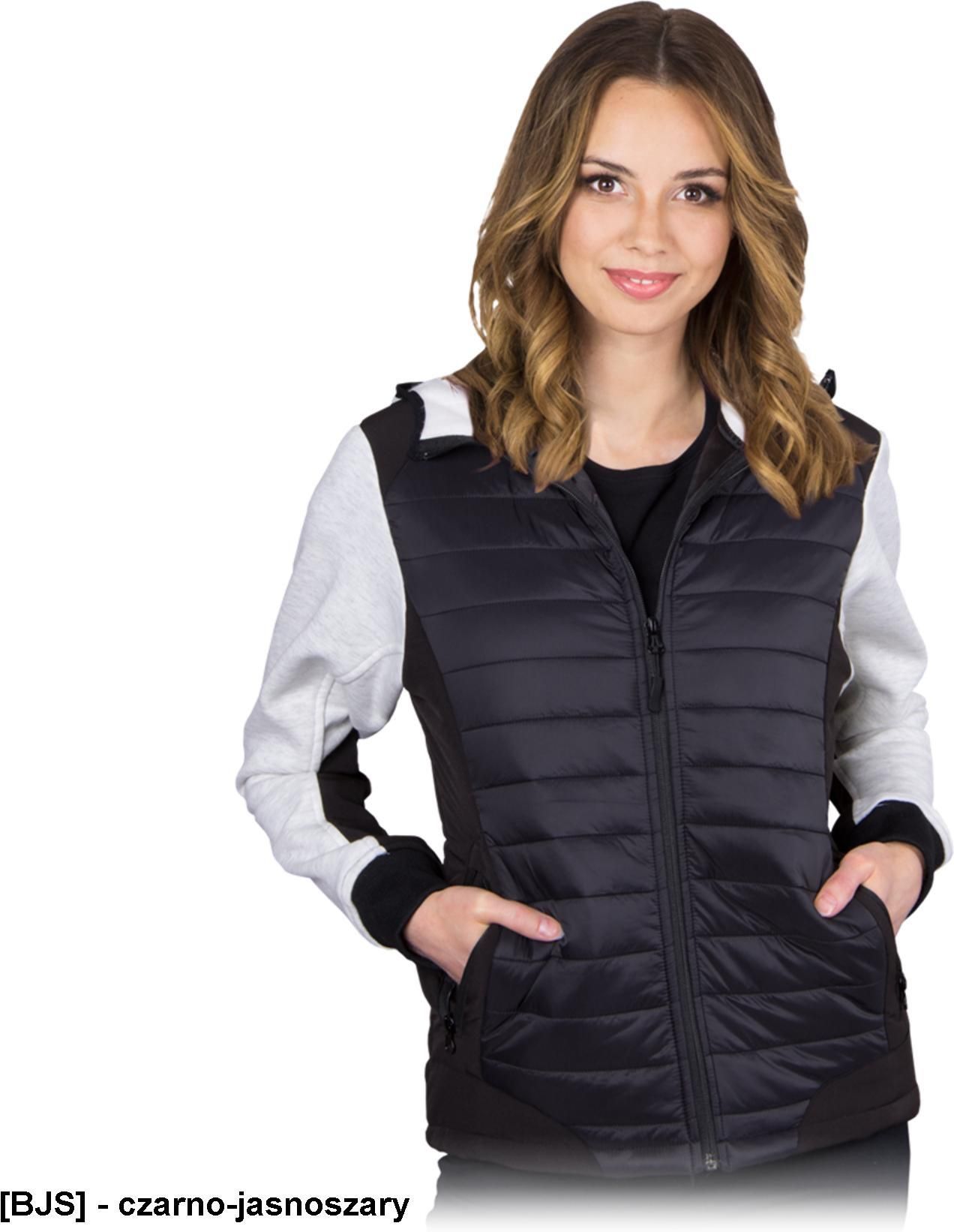 LH-TWIST Kurtka ochronna, damska. powłoka 100% nylon o gramaturze 35 g/m2. Wyściółka 100% poliester o gramaturze 200 g/m2. Podszewka 100% poliester typu tafta 210T o gramaturze 60 g/m2. Czarne wstawki z tkaniny SOFTSHELL 100% poliester o gramaturze 130 g/m2. Jasnoszare wstawki 62% bawełna, 38% poliester o gramaturze 290 g/m2. Zapinana na suwak. Dwie kieszenie w dolnej części bluzy zapinane na suwak. Kaptur wykończony elastyczną lamówką. Rękawy zakończone ściągaczem. Marka: L.HOLLMAN