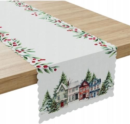 Biały bieżnik z tkaniny WODOODPORNEJ z nadrukiem zimowego miasteczka 38x160 cm zakończony chmurką Niesamowity bieżnik świąteczny wykonany z tkaniny wodoodpornej w magicznym, świątecznym wzorze, sprawi dobre wrażenie zarówno na gościach, jak i domownikach. Nadruk umieszczony na brzegach dekoracji …