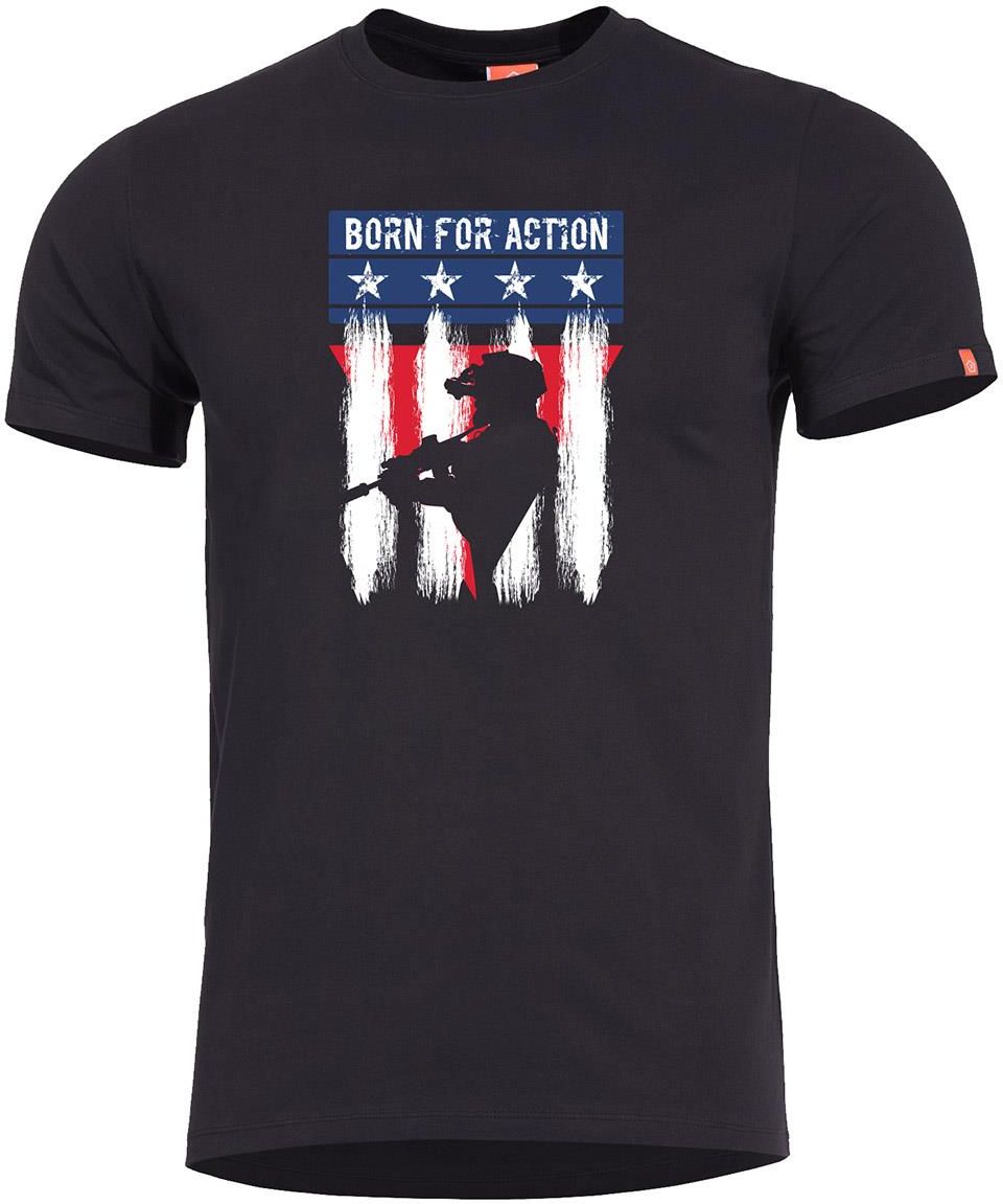 Koszulka z krótkim rękawem uszyta w 100% z wysokogatunkowej bawełny Ring Spun. Przędza Ring Spun to długie, mocno skręcone i cienkie włókna, dzięki którym koszulka jest bardzo wytrzymała i miękka w dotyku. Materiał ma gramaturę 165 g/m2, więc t-shirt jest również lekki i przewiewny. Koszulkę zaprojektowano w taki sposób, aby była wygodna i nie ograniczała swobody ruchów. Na przodzie znajduje się grafika z napisem "Born for action". Dane techniczne: Materiał: 100% bawełna Gramatura: 165 g/m2 Kolor: czarny Producent: Pentagon, Grecja