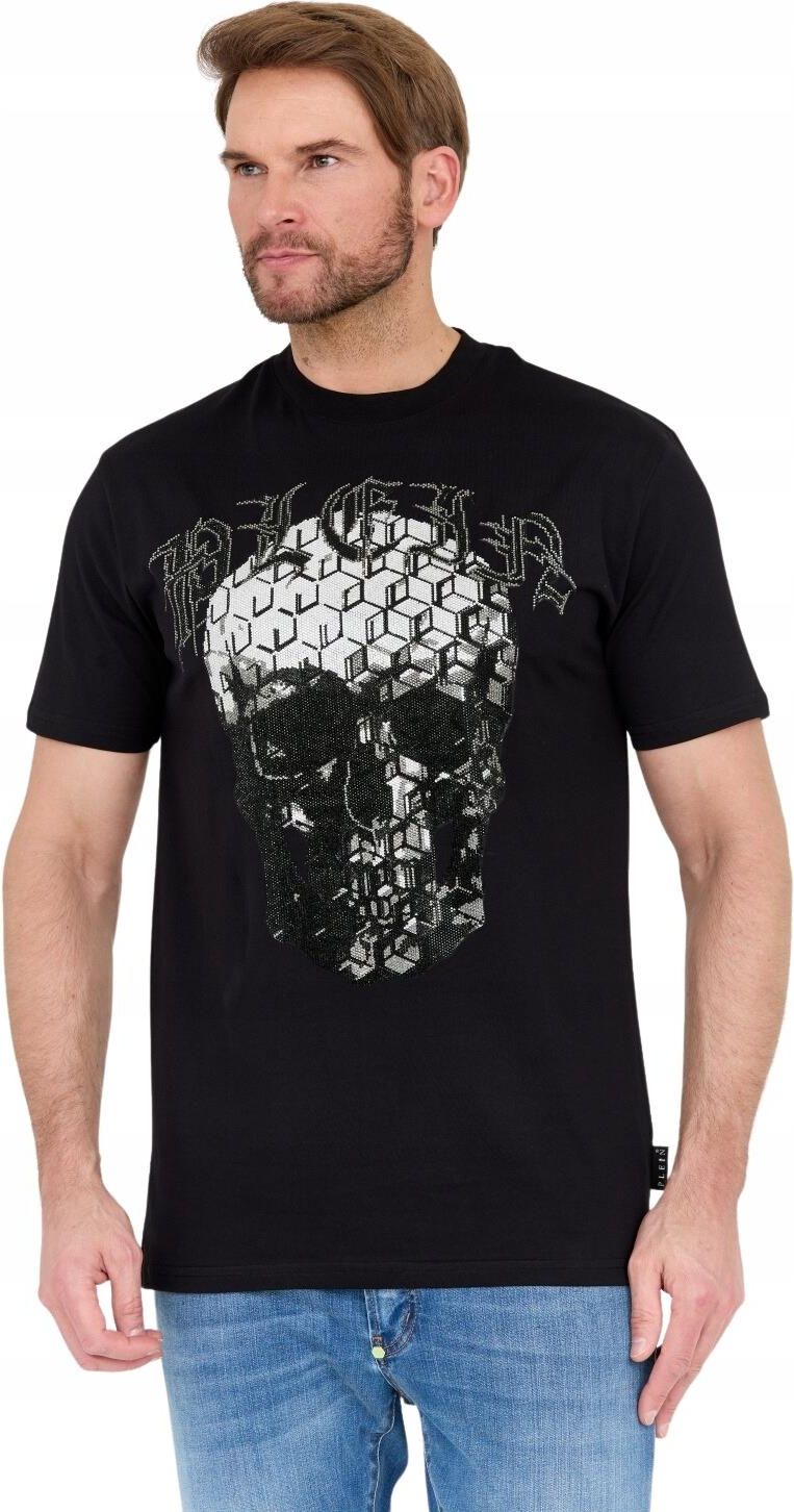 PHILIPP PLEIN Czarny t-shirt zdobiony dżetami z czaszką i logo. Pranie ręczne, prasować w temp. do 110°C, nie suszyć w suszarce, nie wybielać, nie wykręcać. ROZMIAR I DOPASOWANIE: Wymiary modela: Wzrost: 190 cm Klatka: 107 cm Pas: 93 cm Model ma na sobie produkt w rozmiarze L. Wszystkie produkty z …