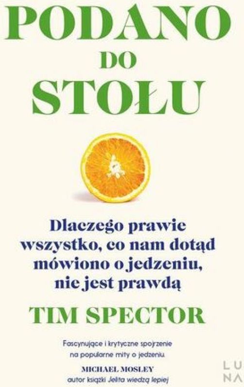 Czy śniadanie rzeczywiście jest najważniejszym posiłkiem dnia? Czy liczenie kalorii ma sens? Czy istnieją dowody na to, że kawa jest dla nas szkodliwa? Dzięki swoim pionierskim badaniom profesor Tim Spector obala te i wiele innych mitów na temat jedzenia. W książce Podano do stołu analizuje skandaliczny brak wiarygodnych badań stojących za wieloma planami dietetycznymi, oficjalnymi zaleceniami i cudownymi kuracjami, i zachęca nas do ponownego przemyślenia naszej relacji z jedzeniem – nie tylko dla naszego zdrowia jako jednostek, ale dla przyszłości planety. NR 1 NA LIŚCIE BESTSELLERÓW „SUNDAY TIMESA”, bestseller Amazona „Fascynujące i krytyczne spojrzenie na popularne mity o jedzeniu”. Michael Mosley, autor książki Jelita wiedzą lepiej „Ta książka powinna być dostępna na receptę”. Felicity Cloake, autorka książek, dziennikarka specjalizująca się w kulinariach „Rewolucja żywieniowa już trwa, a Tim Spector stał się jednym z jej pionierów. To, co pisze, jest pouczające i niezwykle aktualne”. Yotam Ottolenghi, pisarz, restaurator i pisarz kulinarny „Ta książka pomoże ci zdecydować, co dodać do listy następnych zakupów w sklepie spożywczym… To jedna z najbardziej klarownych i przystępnych książek o odżywianiu, jakie czytałam. Odświeżająco bezstronna, głęboko pouczająca i wolna od modnych zasad dietetycznych”. Bee Wilson, „Guardian” „Dementuje dekady fałszywych informacji. Podano do stołu to fascynująca lektura”. Tony Turnbull, „The Times” „ Podano do stołu to przebój literatury na temat żywienia”. Niall Toner, „Sunday Times” „Obok tej książki nie można przejść obojętnie. Jest punktem wyjścia do dyskusji na temat żywienia w Polsce”. dr inż. Agnieszka Leciejewska, specjalista dietetyk Tim Spector – profesor epidemiologii genetycznej w King’s College w Londynie i honorowy konsultant w szpitalach Guy’s i St Thomas’. Wielokrotnie nagradzany ekspert w dziedzinie medycyny personalizowanej i mikrobiomu jelitowego oraz autor książek, w tym bestsellerowych Podano do stołu , Food for Life i The Diet Myth . Regularnie występuje w telewizji, radiu i podcastach na całym świecie i stał się jednym ze stu najczęściej cytowanych naukowców. Jest współzałożycielem firmy ZOE zajmującej się spersonalizowanym żywieniem i kieruje największym na świecie obywatelskim projektem naukowym dotyczącym zdrowia – badaniem ZOE Health. W 2020 roku został nagrodzony Orderem Imperium Brytyjskiego za swoją pracę przy zwalczaniu epidemii COVID-19.