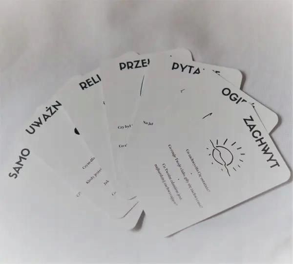 To narzędzie dla każdego, kto zdecyduje się wniknąć w głąb siebie i innych. Talia zawiera 60 kart. Każda karta dotyczy konkretnego tematu, np: miłość, dom, pieniądz, tradycja, samotność...Na każdej karcie znajdują się 4 pytania eksplorujące dany temat. Są karty z "lżejszymi" tematami ale też takie, które dotykają tematów bardzo osobistych i związanych z dużymi emocjami. Przed wykorzystaniem tali do pracy z grupą lub klientem warto zapoznać się z tematami i podjąć decyzję czy wykorzystamy wszystkie karty czy tylko ich część. Kart Głębokiego Poznania możesz używać: na warsztatach rozwoju osobistego na sesjach coachingowych do pogłębiania relacji (z partnerami, rodziną, przyjaciółmi itp.) w pracy terapeutycznej w pracy z samym/ samą sobą Jak używać? W grupie warsztatowej Każdy może wybrać jak głęboko wniknie i czy w ogóle ma ochotę udzielać odpowiedzi na pytania. Podstawowymi zasadami gry są dobrowolność oraz poufność. Karty skonstruowane są w taki sposób, by pytania w nich zawarte były jak najmniej sugerujące. Oznacz to, że ich interpretacja jest dowolna. Nie ma złych i dobrych odpowiedzi. Wersja 1 Zaproś uczestników do wylosowania po 3 karty. Poproś aby przeczytali pytania, a następnie zastanowili się na które z nich chcą odpowiedzieć. Zaproś uczestników aby podzielili się odpowiedziami z grupą Zapytaj czy ktoś chciałby też odpowiedzieć na jakieś pytanie, które usłyszał Wersja 2 Zaproś uczestników do wylosowania po 3 karty. Poproś aby przeczytali pytania, a następnie zastanowili się na które z nich chcą odpowiedzieć. Poproś uczestników aby połączyli się w pary i porozmawiali o swoich pytaniach. Daj na to 5-10 minut. W połowie czasu powiedź, że teraz zmiana odpowiadającego. W tej wersji poproś uczestników o aktywne słuchanie, czyli wyrażanie zainteresowania i zadawanie pytań dodatkowych osobie odpowiadających, najlepiej pytań otwartych. Wyjaśnij, że dla słuchającego ćwiczenie wspiera rozwój empatii. Odpowiadający zaś ma okazję dzięki pytaniom głębiej i bardziej wieloaspektowo poznać siebie. W coachingu Pytania na taliach kart mają charakter eksploatacyjny, np. karta Miłość zawiera pytania:Co pierwsze przychodzi Ci na myśl gdy słyszysz słowo "miłość?Kiedy doświadczasz miłości?Jak się wtedy czujesz?Czym wg Ciebie jest prawdziwa miłość?60 różnych tematów na kartach może być inspiracją dla coacha, mogą one również posłużyć głębszemu poznaniu klienta przez coacha, jak i klienta przez samego siebie. Do pracy autorefleksyjnej Możesz codziennie losować kartę dnia lub poświęcić wieczór, by przyjrzeć się większej ilości tematów. Warto zapisać własne odpowiedzi i dodatkowo zastanowić się nad pytaniami: skąd to wiem? gdzie o tym słyszałam? czy to jest moje przekonanie czy cudze? dlaczego tak sądzę? jakie to ma dla mnie konsekwencje w życiu? O Autorce Weronika Liberska – w 2019 roku powstało Pole Poznania jako inicjatywa niosąca dobrostan i podróż w głąb Siebie oraz manifestację potencjału.Jestem magistrem psychologii oraz trenerką umiejętności psychospołecznych, konsultantką Kronik Akaszy i przedsiębiorczynią. Prowadzę szkolenia z zakresu samopoznania, redukcji stresu, uważności i relacji. Jestem autorką popularnych kart terapeutycznych, o nazwie ,,Karty Głębokiego Poznania”. Łączę wiedzę akademicką z duchowością.Nie powiem Ci jak masz żyć, bo Ty już to dobrze wiesz. Mogę pomóc Ci połączyć się ze Źródłem, skontaktować ze sobą.Tylko tyle.Nie ma innej drogi. Parametry szczegółowe Autor: Weronika Liberska Liczba kart: 60 kart Rok wydania: 2023 Oprawa: miękka Wydanie: 1 Szerokość: 8 cm Wysokość: 12 cm Waga: 0,157 kg