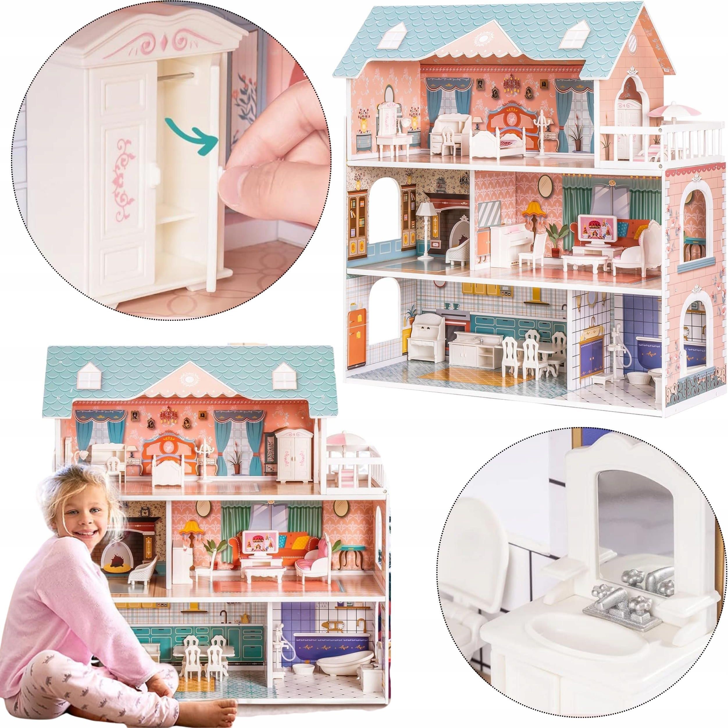 Drewniany domek dla lalek ROBUD z akcesoriami i meblami dla dzieci od 3 lat Piękny, solidny drewniany domek dla lalek ROBUD w stylu księżniczki. Idealny dla dzieci od 3 lat oraz lalek o wysokości 7,5–15 cm. Willa ma 3 poziomy, 5 pomieszczeń i balkon, a w zestawie znajduje się 28 sztuk mebli i akcesoriów. Wyposażenie Zestaw zawiera komplet mebli do wszystkich pomieszczeń, m.in. łóżko, szafki z otwieranymi drzwiczkami, stolik, krzesełka i akcesoria do kuchni, łazienki i salonu. Korzyści dla dziecka rozwój wyobraźni i kreatywności doskonała zabawa w odgrywanie ról ćwiczenie koordynacji i zdolności manualnych Najważniejsze cechy Wymiary: ok. 62 × 45 × 10 cm Materiał: drewno + akcesoria z trwałego plastiku Styl: retro, pastelowe kolory, elegancki wygląd Waga: ok. 6 kg Wiek: 3+ Łatwy montaż Domek dostarczany jako elementy do złożenia. Czytelna instrukcja ze zdjęciami umożliwia szybki montaż w 20–60 minut. 🎁 Idealny prezent Świetny pomysł na urodziny, święta lub Dzień Dziecka. Piękna, stabilna i funkcjonalna zabawka na lata.
