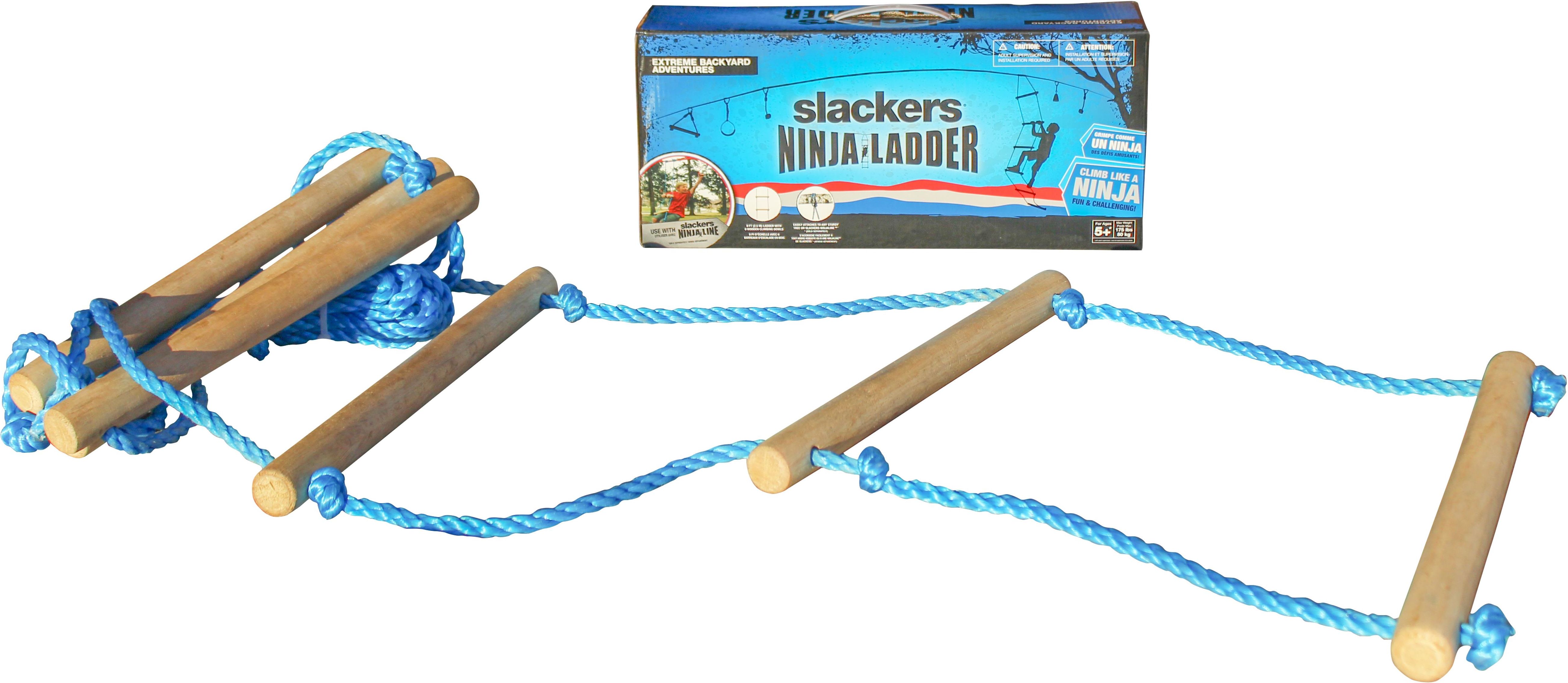 Slackers Ninja drabina Solidna, uniwersalna drabina linowa z liny z tworzywa sztucznego o długości 2,5 m z 6 okrągłymi, solidnymi drewnianymi szczeblami o szerokości 38 cm. Dzięki karabińczykowi na szczycie drabinki linowej można go przymocować do linii ninja, ram skrzydłowych, domów na drzewie lub gałęzi bez narzędzi. Maksymalna ładowność: 80 kg