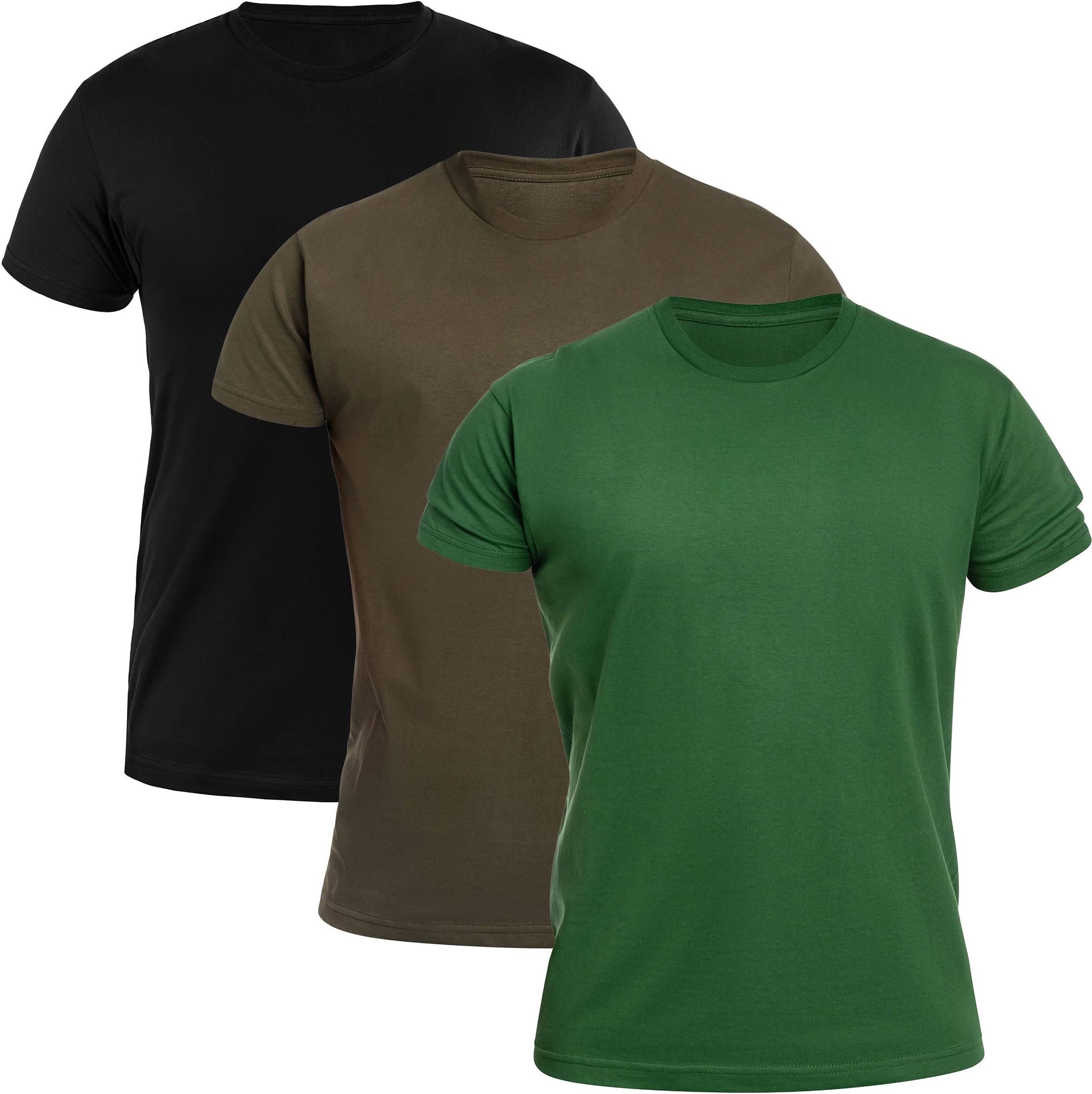 Zestaw 3 koszulek wojskowych z krótkim rękawem w różnych kolorach, wykonanych w 100% z wysokogatunkowej bawełny czesanej o gramaturze 190 g/m2. Zastosowany materiał umożliwia odpowiednią cyrkulację powietrza, co pomaga w utrzymaniu komfortu termicznego.