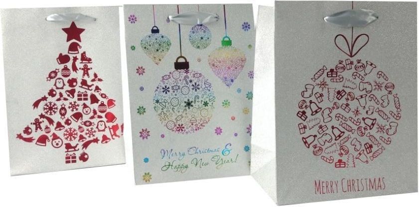 Mix wzorów, towar wysyłany losowo. Torebka świąteczna, pionowa o wymiarach 18x23x10 cm. Dostępna w 3 wzorach. Brokatowa. Kolor sznureczka idealnie komponuje się z kolorystyką torebki. Posiada wzmacniany spód. Format: 230x180 mm