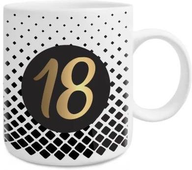 - Gigantyczny kubek na 18 - Ogromny urodzinowy kubek - Kubek koloru białego z czarnym wzorem geometrycznym - Nadrukowana wielka liczba 18 w kolorze złotym - Zapakowany w prezentowy kartonik - Należy myć ręcznie i nie używać w mikrofalówce - Pojemność: aż 800 ml! - Super prezent na osiemnastkę dla dziewczyny