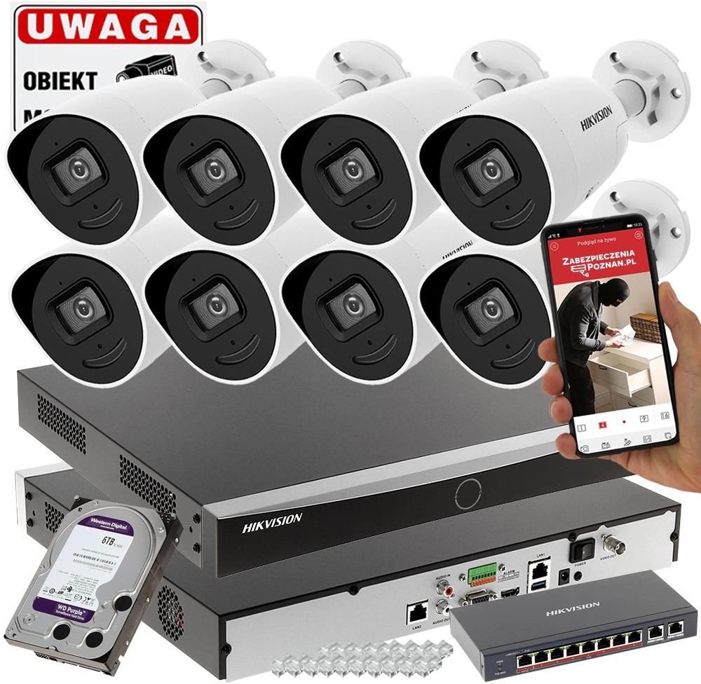 Zestaw monitoringu zawiera: 8x Kamera IP Hikvision DS-2CD2046G2-IU/SL(2.8MM)(C) Acusense DarkFighter 4Mpx, 1x Rejestrator IP Hikvision DS-7608NXI-I2/S(C) Acusense na 8 kamer do 8MPx, 1x Switch PoE Hikvision DS-3E0310HP-E 8-PORTOWY, 1x Dysk do monitoringu WD 6TB HDD-WD62PURX, 18x wtyk RJ-45 1x Tablica informacyjna