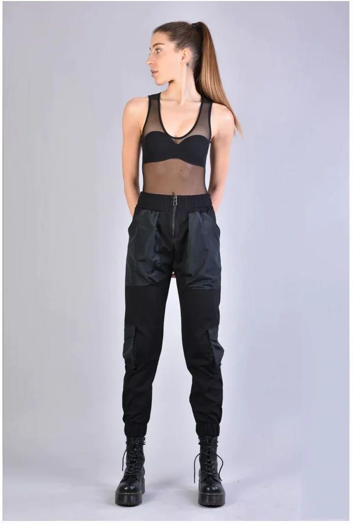 Prosty fason W pasie wszyta guma, dodatkowo zapinane na zamek Ze średnim stanem Z przodu dwie kieszenie, dodatkowe kieszenie na nogawkach Z łączonych tkanin Nogawki wykończone ściągaczami Wykonano z wysokiej jakości tkaniny Wyprodukowane we Włoszech