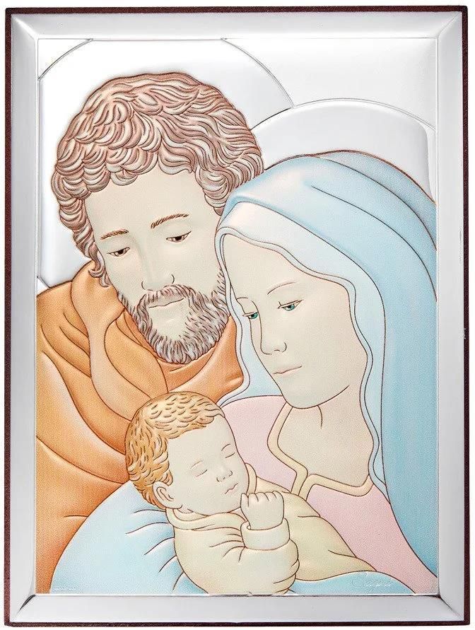 Obrazek srebrny z wizerunkiem Świętej Rodziny to obraz zjednoczenia (komunii) Świętych Osób. Jednocześnie obraz ten wyraża zjednoczenie, miłość, życie małżeństwa i rodziny chrześcijańskiej, która dąży do świętości i do tworzenia komunii we własnym małżeństwie i rodzinie, dzięki czemu jest to doskonały prezent na ślub czy narodziny dziecka. Obrazek wyprodukowany został przez firmę LAR International. Gwarantuje ona, iż przedmiot nabyty przez Państwa został wyprodukowany we Włoszech, z metalu pokrytego czystym srebrem w technologii PVD. Dzięki temu jest odporniejszy na odkształcenia mechaniczne i śniedzenie, doskonale odbija światło, co podkreśla szlachetność srebra. Obrazek zabezpieczony jest warstwą lakieru, która chroni przed czynnikami zewnętrznymi. Wpływa to na bezproblemowe użytkowanie bez potrzeby częstego czyszczenia. Obrazek z wizerunkiem Świętej Rodziny można zarówno powiesić, jak i postawić na dołączonej podstawce. Do czyszczenia zalecamy używanie wyłącznie czystych, miękkich ściereczek, a w przypadku zabrudzeń letniej wody. Nie należy stosować detergentów, alkoholu ani znajdujących się w sprzedaży środków i ściereczek do czyszczenia srebra, gdyż mogą one uszkodzić warstwę ochronną. -opis pochodzi od Dostawcy
