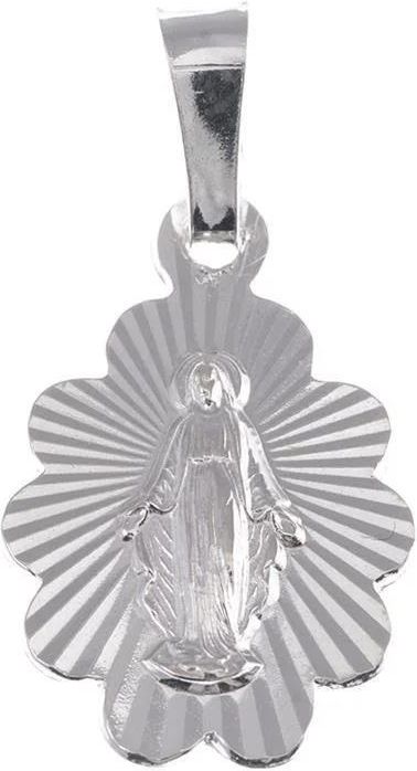 Medalik srebrny Matki Bożej Niepokalanej wykonany ze srebra próby 925. Wymiary medalika: Długość z zawieszką: ok. 2,4 cm Długość bez zawieszki: ok. 1,8 cm Szerokość: ok 1,3 cm Waga: 1,7 - 1,9 g Tył medalika gładki.