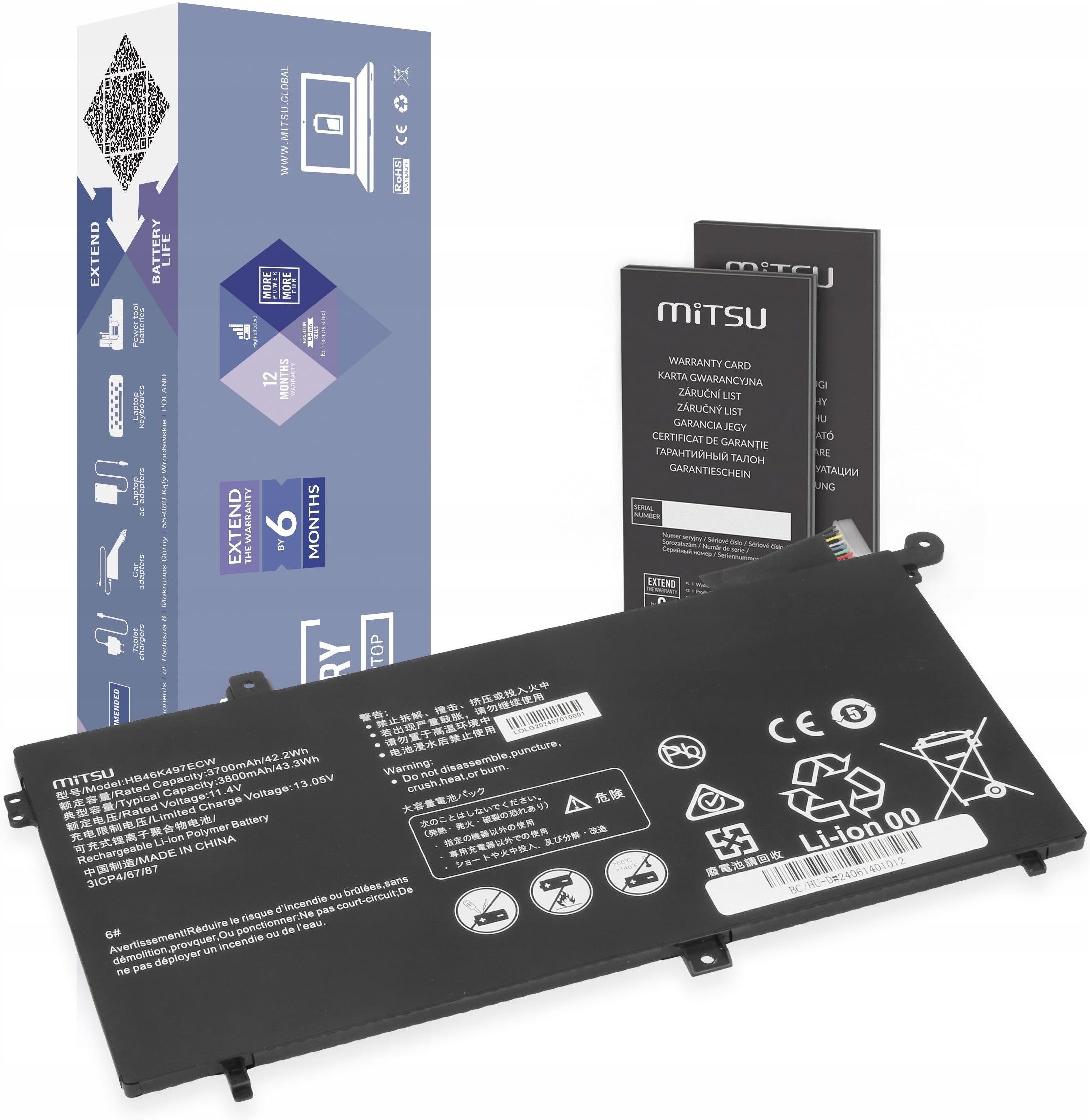 Mitsu - doskonały stosunek jakości do ceny pojemność: 3700 mAh (42.2 Wh) napięcie: 11.4V rzeczywista pojemność certyfikaty: CE i ROHS brak efektu pamięci Zbliżona do oryginału bateria Mitsu z naszej oferty to nie tylko atrakcyjna cena, to również rzetelne i niezawyżone parametry! Wysokiej klasy, sprawdzone, ekologiczne ogniwa litowo-jonowe klasy A firmy Tianneng Battery Group to realna pojemność i wysoka trwałość bez efektu pamięci. Zapewniają długi czas pracy oraz bezproblemowe funcjonowanie. O ich najwyższej jakości świadczą niekwestionowane warunki gwarancji - osiągnięcie 80% nominalnej pojemności baterii uprawnia do jej wymiany. Zaufaj prawdziwej jakości wyspecjalizowanego importera! W tańszych zamiennikach (i nie tylko) producent ogniw jest najczęściej ukrywany lub nieznany. Dlatego też zachęcamy do rozważnego zakupu danej baterii jako lepszej alternatywy dla wątpliwych produktów niewiadomego pochodzenia! Należy uważać na baterie o podejrzanym nazewnictwie, sugerujące wspaniałe działanie przez nieskończoną ilość godzin. Niestety w większości przypadków są to indywidualne importy, pod własną marką, bardzo często z najtańszych i najgorszych komponentów. Najwyższa jakość na rynku Prezentowane na naszej stronie baterie są wykonane z najwyższej jakości komponentów z użyciem wysokiej jakości ogniw litowo-polimerowych, posiadających szereg zabezpieczeń ochronnych przed: głębokim rozładowaniem przeładowaniem przepięciem OVP przegrzaniem OTP zwarciem SCP przeciążeniem prądowym OCP Markowa bateria to długi czas pracy urządzenia, zaoszczędzone pieniądze, dzięki długiej żywotności ogniw oraz rzadszej konieczności ich wymiany. Możesz mieć pewność pełnej kompatybilności z elektroniką i oprogramowaniem Twojego laptopa. Bateria komunikuje się z urządzeniem podobnie jak oryginał. Łatwa w montażu. To oszczędność Twojego czasu i środowiska. Certyfikaty Baterie do laptopów skierowane są do najbardziej wymagających użytkowników, ceniących sobie bezstresową i komfortową pracę. O jakości produktu świadczą uzyskane certyfikaty CE i ROHS, ISO9001oraz ścisła kontrola jakości eliminująca powstanie ewentualnych defektów. Kupując baterię MITSU możesz mieć pewność, że jednocześnie dbasz o środowisko naturalne. Producent współpracuje z organizacjami zajmującymi się ekologią, wsparciem selektywnych zbiórek oraz maksymalnym odzyskiem odpadów. Gwarancja +6 Produkt posiada wydłużoną gwarancję poprawnego działania o 6 miesięcy. Wystarczy, że klient w ciągu 60 dni od daty zakupu, zarejestruje numer seryjny produktu na stronie internetowej producenta www.movano.global. Wszystkie szczegółowe informacje znajdują się w karciegwarancyjnejoraz na stronie producenta. Baterie MITSU to wysokiej klasy i ekologiczne ogniwa litowo-polimerowe klasy A rzeczywista deklarowana pojemność znacznie wolniejszy spadek nominalnej pojemności bardzo niska podatność na rozładowania brak efektu pamięci niezawodny i długotrwały czas pomiędzy kolejnymi cyklami ładowania 6-stopniowa kontrola jakości Zaufany producent Nasze baterie pochodzą bezpośrednio od importera, firmy ICO - właściciela uznanych marek, takich jak Movano (ogniwa klasy A+ marki Samsung i LG) oraz Mitsu, który otrzymał Laur Klienta Odkrycie Roku 2017. Dana firma posiada już wieloletnie doświadczenie i dlatego importuje wszystkie produkty tylko od sprawdzonych producentów, którzy w ofercie posiadają produkty najwyższej jakości w danym segmencie cenowym. Baterie od firmy ICO można spotkać w sklepach polskich oraz zagranicznych.