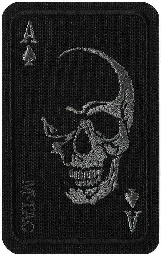 Haftowana naszywka, wykonana z odpornej na przetarcia i rozdarcia Cordury 500D przedstawiająca wizerunek karty asa pik z wyhaftowaną sylwetką czaszki pośrodku. Emblemat został wyposażony w jednostronny rzep, dzięki któremu w prosty sposób można umieścić go na panelu velcro na mundurze, czapce, nerce czy plecaku.