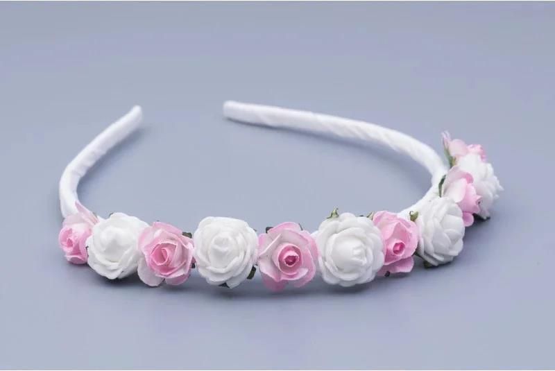 Opaska komunijna wykonana ręcznie. Dzięki estetycznemu wykończeniu opaska wygląda jak ozdobiona żywymi kwiatami. Opaska tego typu to sprawdzony i niezawodny sposób na urozmaicenie każdej komunijnej fryzury. Może być stosowana zarówno na krótkich, jak i na długich włosach. Jest lekka, dzięki czemu nie obciąża głowy. Materiały użyte do produkcji tej opaski wyróżniają się najwyższą jakością, dzięki czemu jest to produkt trwały. Produkt polski