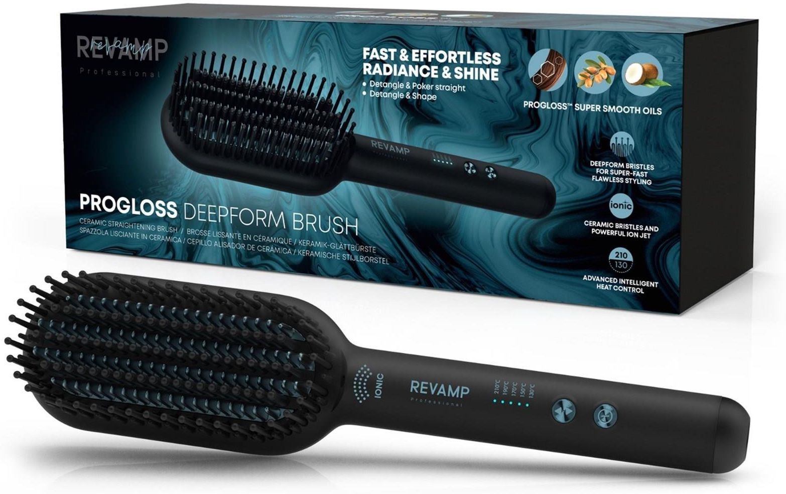 Szczotka Revamp Progloss Deepform Ceramic BR-2000 Odmień swoje włosy za pomocą zaledwie kilku szybkich pociągnięć ceramicznej szczotki do prostowania Revamp Progloss Deepform. Głęboko rozczesujące i prostujące włosie pozwala na jednoczesną stylizację dużych partii włosów z całkowitą łatwością. Dzięki połączeniu technologii jonowej i ceramicznej możesz w mgnieniu oka tworzyć jedwabiście gładkie fryzury bez puszenia się. Szczotka posiada regulowane ustawienia temperatury w zakresie od 130ºC do 210ºC. Dodatkowo wzbogacona jest olejkami Progloss aby otrzymać fryzury godne salonu o zwiększonym połysku. W zestawie znajduje się silikonowa mata odporna na ciepło. Szczotkuj i stylizuj za jednym razem Stylizacja staje się tak łatwa jak szczotkowanie dzięki tej wyjątkowej szczotce do stylizacji na gorąco. Wyposażona w kombinację wyjątkowo długiego, chłodnego włosia DeepForm do rozczesywania dużych partii włosów oraz gorącego ceramicznego włosia, które zapewnia elegancką i gładką stylizację. Możesz łatwo stworzyć piękne fryzury za pomocą zaledwie kilku pociągnięć. Wyeliminuj puszenie się włosów Ceramiczne włosie zapewnia płynne przesuwanie szczotki po włosach, odsłaniając jedwabiście gładkie fryzury, podczas gdy silny strumień jonów bezpośrednio zintegrowany ze szczotką eliminuje puszenie się od nasady aż po same końce. Inteligentna kontrola temperatury Przejmij pełną kontrolę i dostosuj stylizację do swojego rodzaju włosów dzięki regulowanym ustawieniom temperatury od 130ºC do 210ºC. Będziesz gotowa do stylizacji w ciągu kilku sekund dzięki ultraszybkiej technologii grzewczej Pro PTC. Zaawansowana inteligentna kontrola temperatury dodatkowo reguluje temperaturę, minimalizując uszkodzenia włosów. Łatwa w użyciu Aby zapewnić Ci dodatkowy spokój ducha, to narzędzie do stylizacji wyłączy się automatycznie po 60 minutach nieużywania, a dzięki obrotowemu kablowi o długości 3 m uzyskasz większą elastyczność, jeśli chodzi o stylizację włosów. Dla dodatkowego bezpieczeństwa dołączona jest również silikonowa mata chroniąca przed ciepłem. Technologia PROGLOSS Ceramiczny mechanizm nasączony jest keratyną, olejem arganowym i kokosowym, aby nadać włosom dodatkowego blasku i gładkości. KLUCZOWE CECHY Włosie DeepForm zapewnia superszybką, nieskazitelną stylizację - głębsze rozczesywanie i prostowanie włosia umożliwia stylizację większych partii za jednym razem przy mniejszym uszkodzeniu włosów Supergładkie olejki Progloss™ z dodatkiem keratyny, arganu i kokosa Ceramiczne włosie i mocny strumień jonów zapewniają jedwabiste, lśniące i niepuszące się włosy Ultraszybkie cyfrowe nagrzewanie 130ºC - 210ºC - gotowa do stylizacji w kilka sekund i odpowiednia dla wszystkich rodzajów włosów Zaawansowana inteligentna kontrola ciepła, która stale reguluje temperaturę, aby zminimalizować uszkodzenia włosów Ultraszybka technologia grzewcza Pro PTC zapewnia ultraszybkie nagrzewanie i odzyskiwanie ciepła podczas stylizacji za jednym pociągnięciem Automatyczne wyłączanie po 60 minutach Obrotowy kabel salonowy o długości 3 m Silikonowa mata żaroodporna  3 letnia gwarancja
