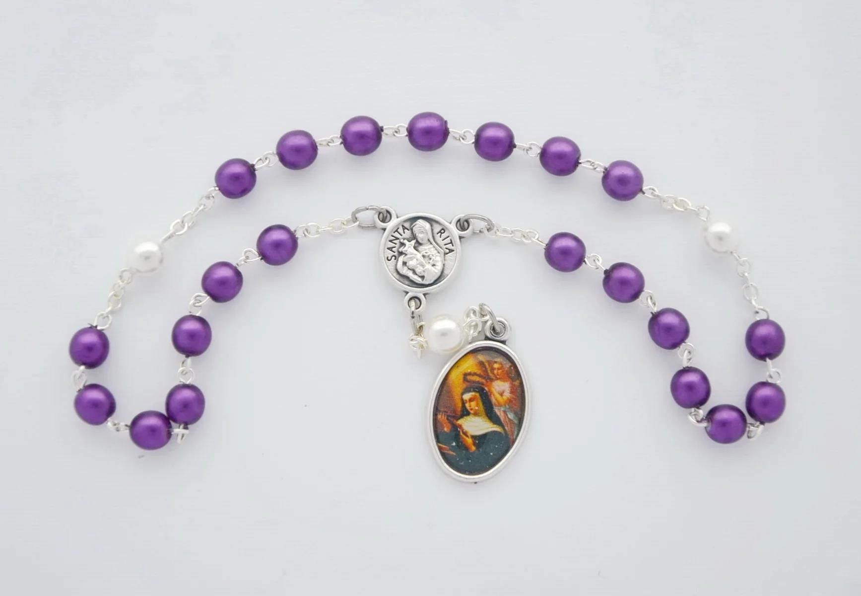 Koronka do św. Rity z obrazkiem. Różaniec z medalikiem Św. Rity. Paciorki w kolorze ciemnofioletowym. W zestawie obrazek z treścią modlitwy do św. Rity.