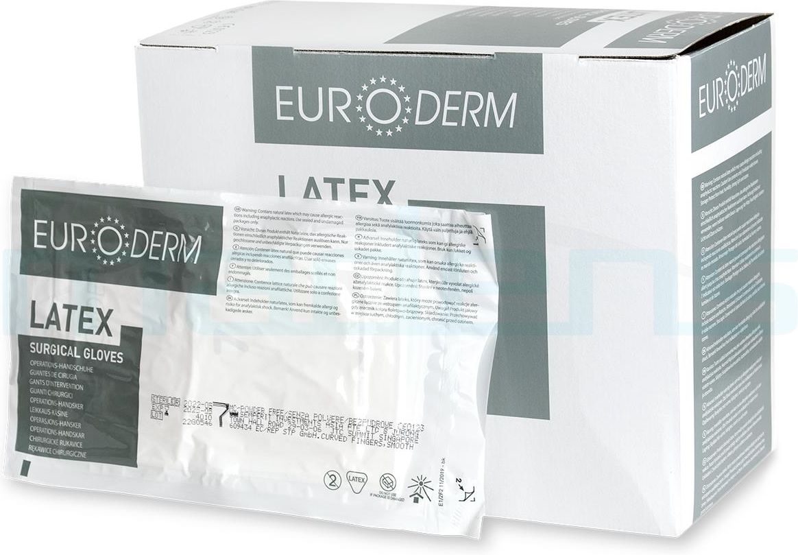 Lateksowe, bezpudrowe rękawiczki chirurgiczne EURODERM MC w anatomicznym kształcie. Zapewniają operującemu swobodę ruchów i pewny chwyt, co przekłada się na wysokie bezpieczeństwo zabiegu. Pakowane parami w sterylne blistry. Cena za 10 par.