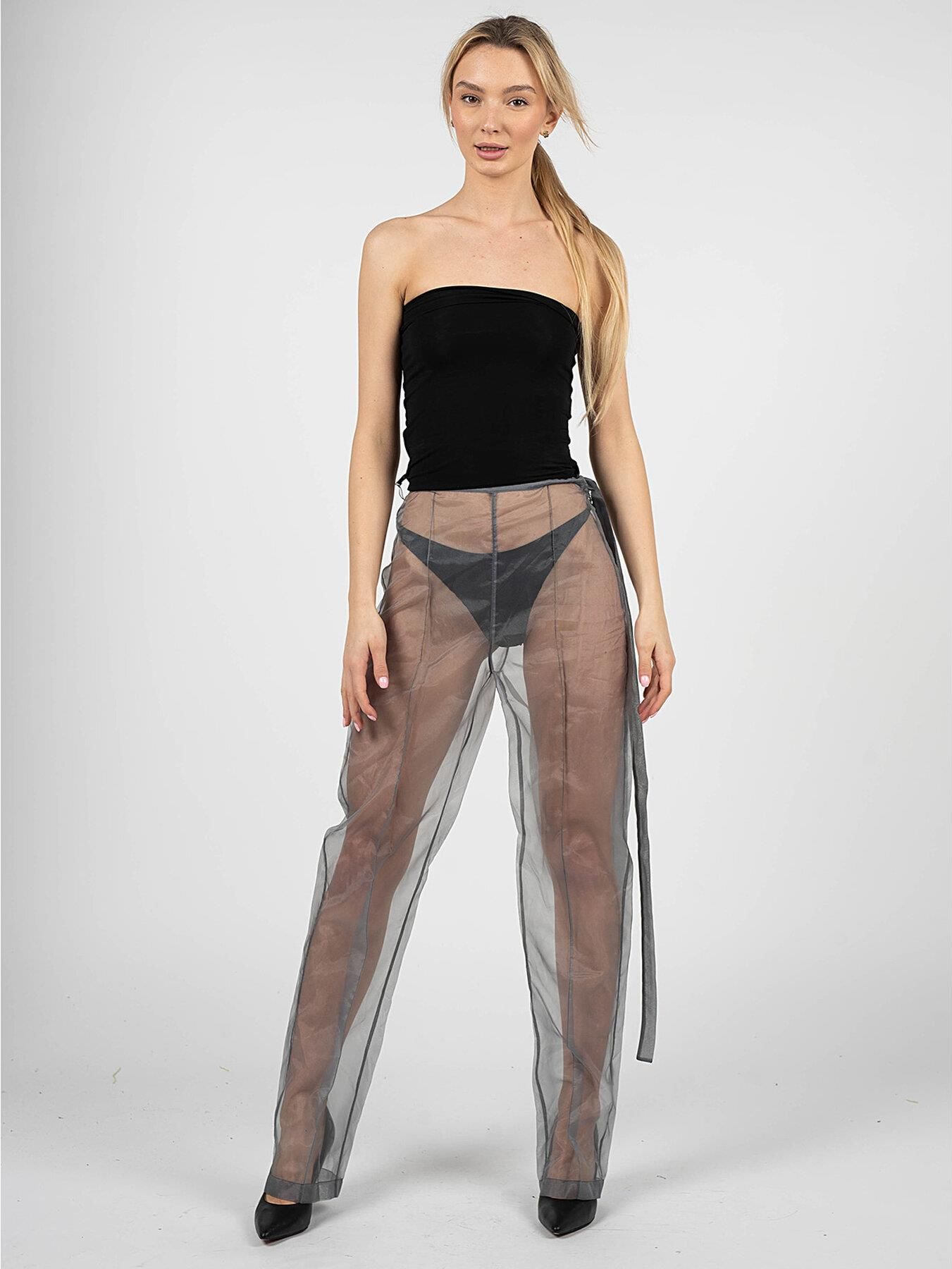 Prosty fason Transparentne Wysoki stan Z subtelnym połyskiem Z lewej strony zapinane na kryty, sygnowany zamek błyskawiczny Dodatkowo w pasie wiązanie Z przodu wzdłuż nogawek przeszycie Wykonane z wysokiej jakości tkaniny Wyprodukowano we Włoszech