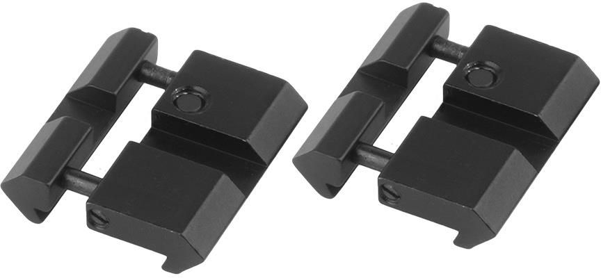 Adaptery na płaską szynę trapezowatą Dovetail o szerokości 11 mm, umożliwiające montowanie na niej akcesoriów w systemie Weaver / Picatinny 21 mm. Wykonane z aluminium anodowanego na czarno. Posiadają blokowany na wkręcane piny mechanizm mocujący ze sprężynami, przez co dopasowują się do kształtu …