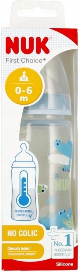 Nuk Butelka z Wskaźnikiem Temp. 300 ml 0-6m First Choice Niebieska 527910 Butelka First Choice z wbudowanym wskaźnikiem temperatury zmienia swój kolor w zależności od temperatury zawartości butelki: jeżeli pokarm jest za gorący, wskaźnik, który zwykle jest niebieski zmienia kolor na biały. Wskaźnik temperatury NUK jest przewidziany jako dodatkowa weryfikacja. Prosimy o sprawdzenie temperatury bezpośrednio przed podaniem pokarmu dziecku. Butelka posiada wyjątkowo miękki smoczek silikonowy dostosowany do kształtu jamy ustnej. Butelka testowana w szpitalach dla optymalnego łączenia karmienia piersią i butelką. Posiada antykolkowy system odpowietrzania który pomaga zapobiegać kolce. Wygodna do napełniania i czyszczenia posiada szeroki otwór butelki. Butelka o pojemności 300 ml 0-6m ze smoczkiem silikonowym w rozmiarze M. wymiary produktu (wys. x szer.)[cm]: 19x6, wymiary opakowania (wys. x szer.. x gł.)[cm]: 21x7x7, waga produktu bez opakowania [kg]: 0,07 kg, waga produktu w opakowaniu [kg]: 0,10 kg. Produkt przeznaczony dla dzieci w wieku: 0-6m+