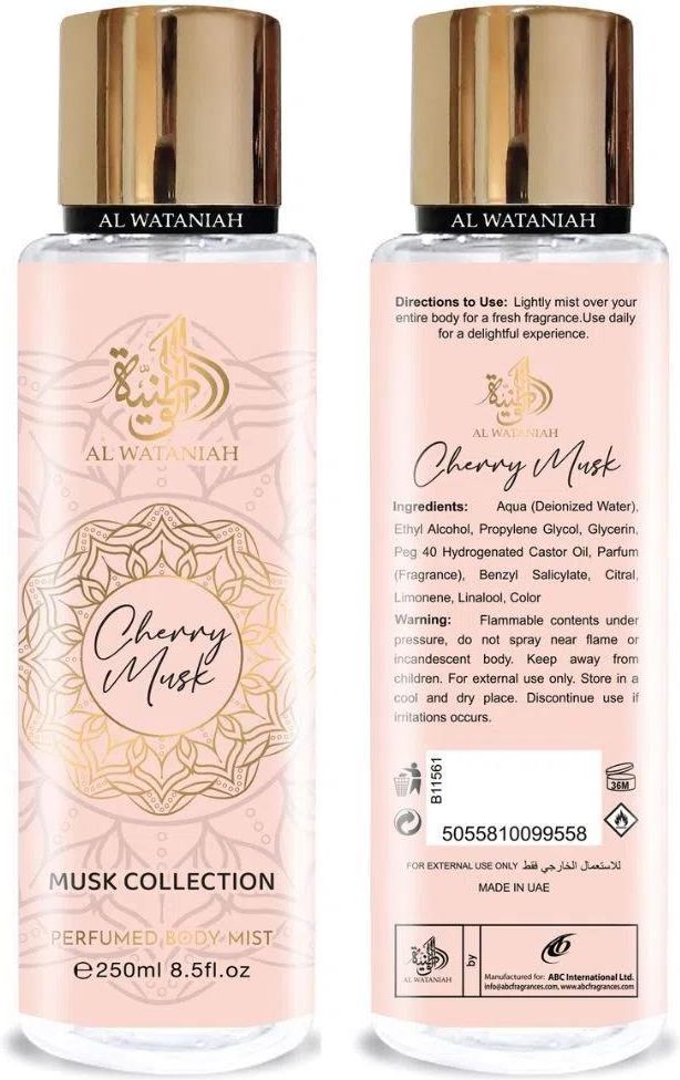 AL WATANIAH MGIEŁKA CHERRY MUSK MGIEŁKA DO CIAŁA 250ML PERFUMY DAMSKIE NUTY ZAPACHOWE: Nuty głowy: Soczyste wiśnie – wprowadzają intensywną słodycz i owocową świeżość, przywołując obrazy letnich sadów. Nuty serca:Delikatne kwiatowe akcenty – dodają kompozycji subtelności i elegancji. Nuty bazy: Zmysłowe piżmo – zapewnia trwałość zapachu i otula skórę ciepłym, pudrowym aromatem. Perfumed Body Mist Cherry Musk to wyjątkowa mgiełka do ciała, która łączy w sobie soczystą słodycz dojrzałych wiśni z subtelną głębią piżma, tworząc zmysłową i elegancką kompozycję zapachową. Ten produkt, pochodzący ze Zjednoczonych Emiratów Arabskich, oferuje uczucie świeżości i luksusu, idealne na każdą porę dnia.