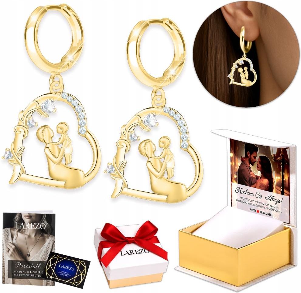 Larezo Złote Kolczyki 925 Serca Matka z Dzieckiem Serduszka dla Mamy z Cyrkoniami Grybów