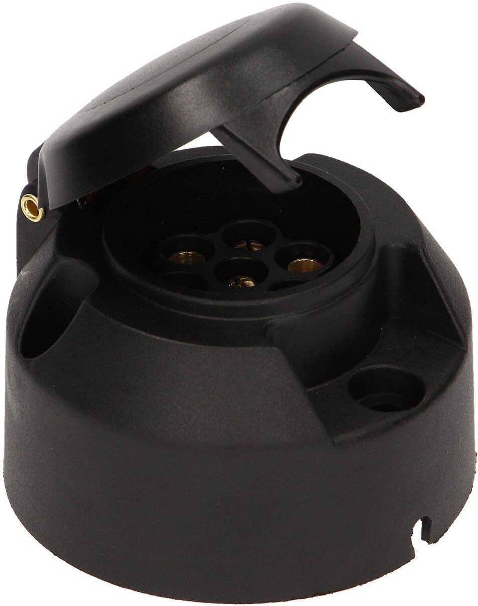 Gniazdo przeznaczone do podłączenia elektrycznego przyczepy samochodowej. Gniazdo wykonano z czarnego plastiku i wyposażono w 7 pinów, przeznaczone do istalacji elektrycznej 12/24V. Parametry techniczne: zasilanie: 12/24V ilość pinów: 7 kolor: czarny materiał: plastik