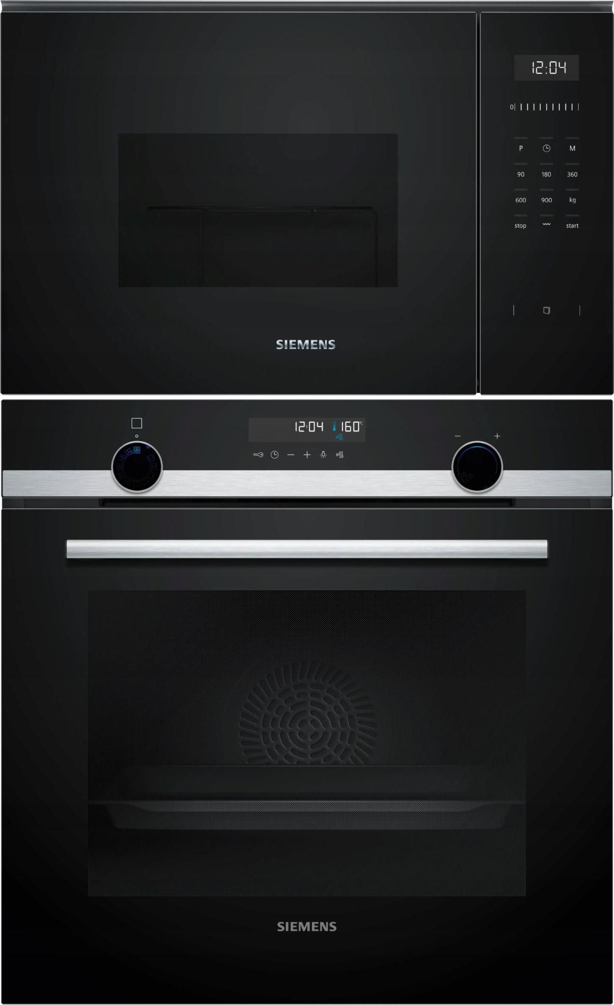 Siemens HB578GES3 + BE555LMB1 NAJWAŻNIEJSZE CECHY URZĄDZENIA Piekarnik Siemens HB578GES3 Najważniejsze parametry: Wymiary urządzenia (wys. x szer. x gł.): 595x594x548 mm Klasa efektywności energetyczne: A+ Zintegrowany system czyszczący: Pyrolityczny + Hydrolityczny activeClean®: automatyczny system samoczyszczenia. Liczba typów ogrzewania: 9 Dostępny zakres temperatur: 30-275 °C Objętość użytkowa (wnętrza): 71 l Kuchenka mikrofalowa Siemens BE555LMB1 Najważniejsze parametry: Instalacja: Do zabudowy Kolor: Czarny, stal nierdzewna Pojemność: 25l Kolor wyświetlacza: Biały LED ze sterowaniem dotykowym Poziomy mocy mikrofal (W): 90, 180, 360, 600, 900 W Moc Grilla: 1200 W Zintegrowany system czyszczący: Hydrolityczny cookControl8: programy automatyczne (8)