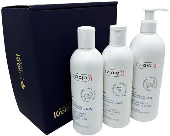 Zestaw Prezentowy Ziaja MED, Kuracja Dermatologiczna pielęgnująca skóry z AZS Zestaw składa się z Ziaja MED Kuracja dermatologiczna pielęgnująca skóry z AZS, Natłuszczający olejek myjący do kąpieli i pod prysznic, 270ml Ziaja MED Kuracja dermatologiczna pielęgnująca skóry z AZS, Szampon …